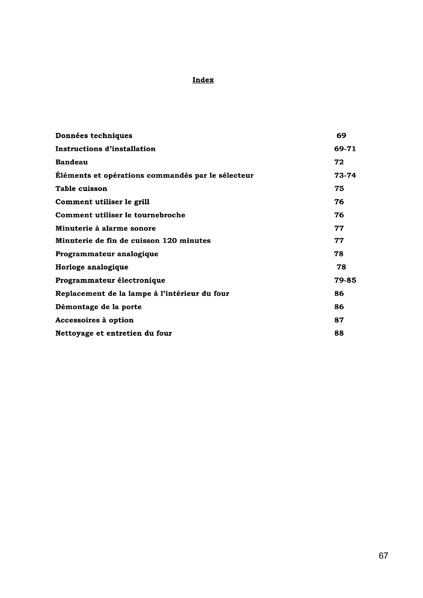 SIndex Données techniques 69 Instructions d’installation 69-71 Bandeau 72 Éléments et opérations commandés par le sélecteur 73-74 Table cuisson 75 Comment utiliser le grill 76 Comment utiliser le tournebroche 76 Minuterie à alarme sonore 77 Minuterie de fin de cuisson 120 minutes 77 Programmateur analogique 78 Horloge analogique 78 Programmateur électronique 79-85 Replacement de la lampe à l’intérieur du four 86 Démontage de la porte 86 Accessoires à option 87 Nettoyage et entretien du four 88 67Nous vous remercions de la confiance que vous nous avez témoigné en choisissant un de nos produits de qualité. Notre société souhaite vivement que vous puissiez profiter au mieux des prestations de cet appareil, prestations qui ont orienté votre choix. C'est pour cette raison que nous vous invitons à suivre attentivement les instructions de ce manuel, en ne prenant en compte que les paragraphes concernant les accessoires et les instruments livrés avec votre appareil.