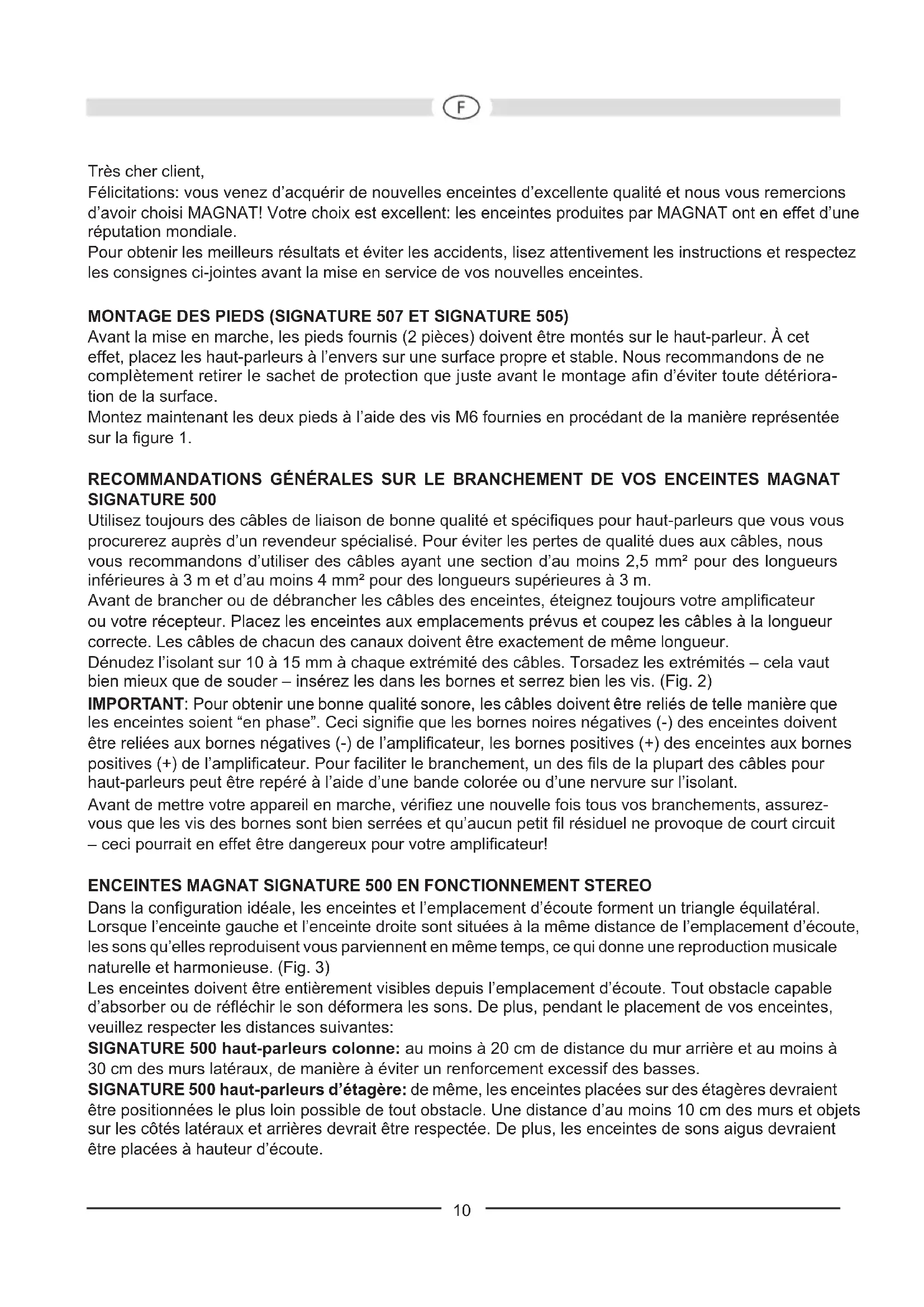 Conguration: 3 way, bass reex 3 way, bass reex Power-handling capacity: 100 / 170 W 110 / 180 W Impedance: 4 – 8 ohms 4 – 8 ohms Frequency response: 32 – 53 000 Hz 32 – 53 000 Hz Recommended amplier output: > 20 W > 20 W Efciency (2.8V / 1m): 91 dB 91 dB Dimensions (WxHxD): 205 x 365 x 282 mm 550 x 205 x 282 mm Subject to technical change. 9Très cher client, Félicitations: vous venez d’acquérir de nouvelles enceintes d’excellente qualité et nous vous remercions d’avoir choisi MAGNAT! Votre choix est excellent: les enceintes produites par MAGNAT ont en effet d’une réputation mondiale. Pour obtenir les meilleurs résultats et éviter les accidents, lisez attentivement les instructions et respectez les consignes ci-jointes avant la mise en service de vos nouvelles enceintes. MONTAGE DES PIEDS (SIGNATURE 507 ET SIGNATURE 505) Avant la mise en marche, les pieds fournis (2 pièces) doivent être montés sur le haut-parleur. À cet effet, placez les haut-parleurs à l’envers sur une surface propre et stable. Nous recommandons de ne complètement retirer le sachet de protection que juste avant le montage an d’éviter toute détériora- tion de la surface. Montez maintenant les deux pieds à l’aide des vis M6 fournies en procédant de la manière représentée sur la gure 1. RECOMMANDATIONS GÉNÉRALES SUR LE BRANCHEMENT DE VOS ENCEINTES MAGNAT SIGNATURE 500 Utilisez toujours des câbles de liaison de bonne qualité et spéciques pour haut-parleurs que vous vous procurerez auprès d’un revendeur spécialisé. Pour éviter les pertes de qualité dues aux câbles, nous vous recommandons d’utiliser des câbles ayant une section d’au moins 2,5 mm² pour des longueurs inférieures à 3 m et d’au moins 4 mm² pour des longueurs supérieures à 3 m. Avant de brancher ou de débrancher les câbles des enceintes, éteignez toujours votre amplicateur ou votre récepteur. Placez les enceintes aux emplacements prévus et coupez les câbles à la longueur correcte. Les câbles de chacun des canaux doivent être exactement de même longueur. Dénudez l’isolant sur 10 à 15 mm à chaque extrémité des câbles. Torsadez les extrémités – cela vaut bien mieux que de souder – insérez les dans les bornes et serrez bien les vis. (Fig. 2) IMPORTANT: Pour obtenir une bonne qualité sonore, les câbles doivent être reliés de telle manière que les enceintes soient “en phase”. Ceci signie que les bornes noires négatives (-) des enceintes doivent être reliées aux bornes négatives (-) de l’amplicateur, les bornes positives (+) des enceintes aux bornes positives (+) de l’amplicateur. Pour faciliter le branchement, un des ls de la plupart des câbles pour haut-parleurs peut être repéré à l’aide d’une bande colorée ou d’une nervure sur l’isolant. Avant de mettre votre appareil en marche, vériez une nouvelle fois tous vos branchements, assurez- vous que les vis des bornes sont bien serrées et qu’aucun petit l résiduel ne provoque de court circuit – ceci pourrait en effet être dangereux pour votre amplicateur!