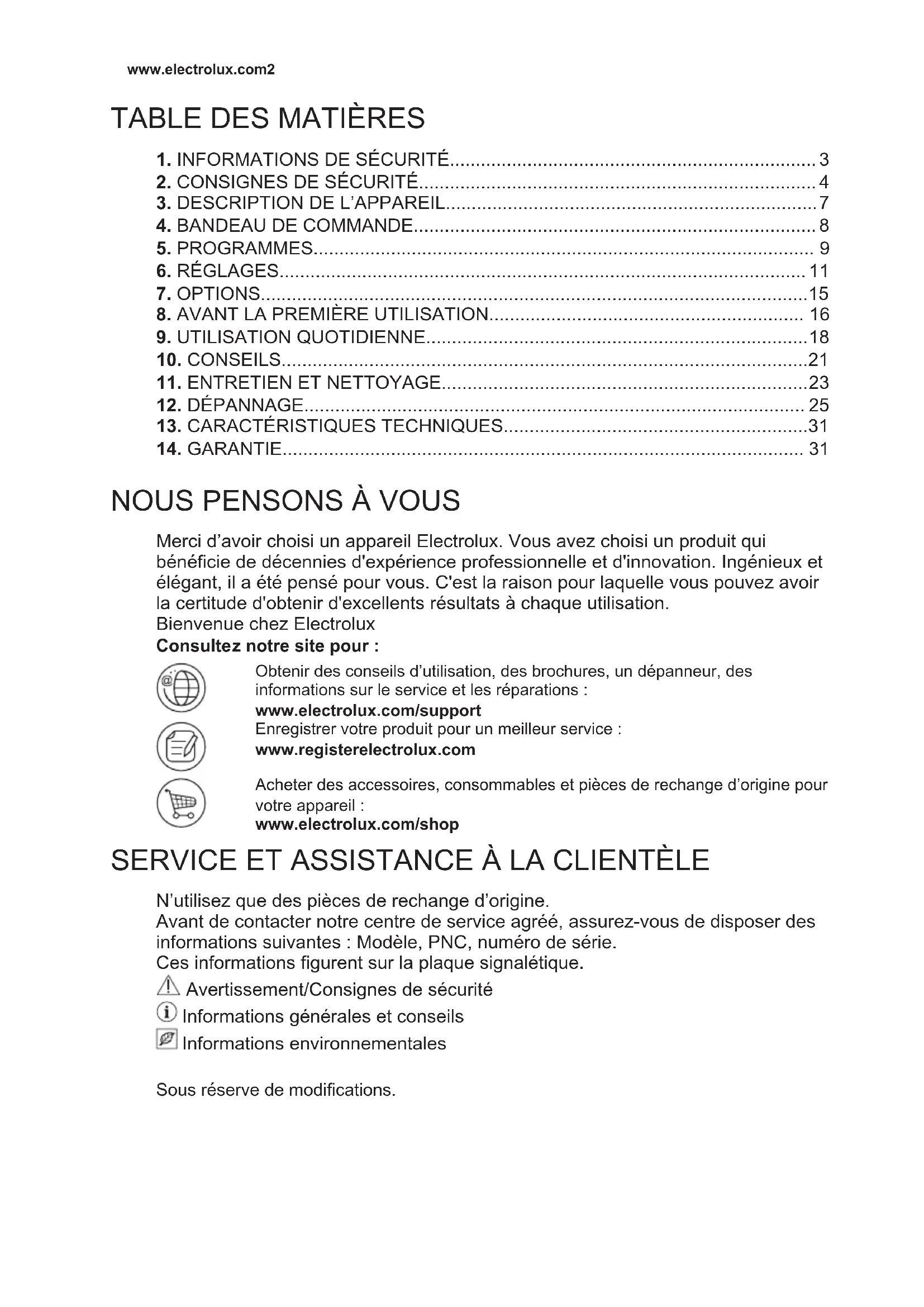 Merci d’avoir choisi un appareil Electrolux. Vous avez choisi un produit qui bénéficie de décennies d'expérience professionnelle et d'innovation. Ingénieux et élégant, il a été pensé pour vous. C'est la raison pour laquelle vous pouvez avoir la certitude d'obtenir d'excellents résultats à chaque utilisation. Bienvenue chez Electrolux Consultez notre site pour : Obtenir des conseils d’utilisation, des brochures, un dépanneur, des informations sur le service et les réparations : www.electrolux.com/support Enregistrer votre produit pour un meilleur service : www.registerelectrolux.com Acheter des accessoires, consommables et pièces de rechange d’origine pour votre appareil : www.electrolux.com/shop