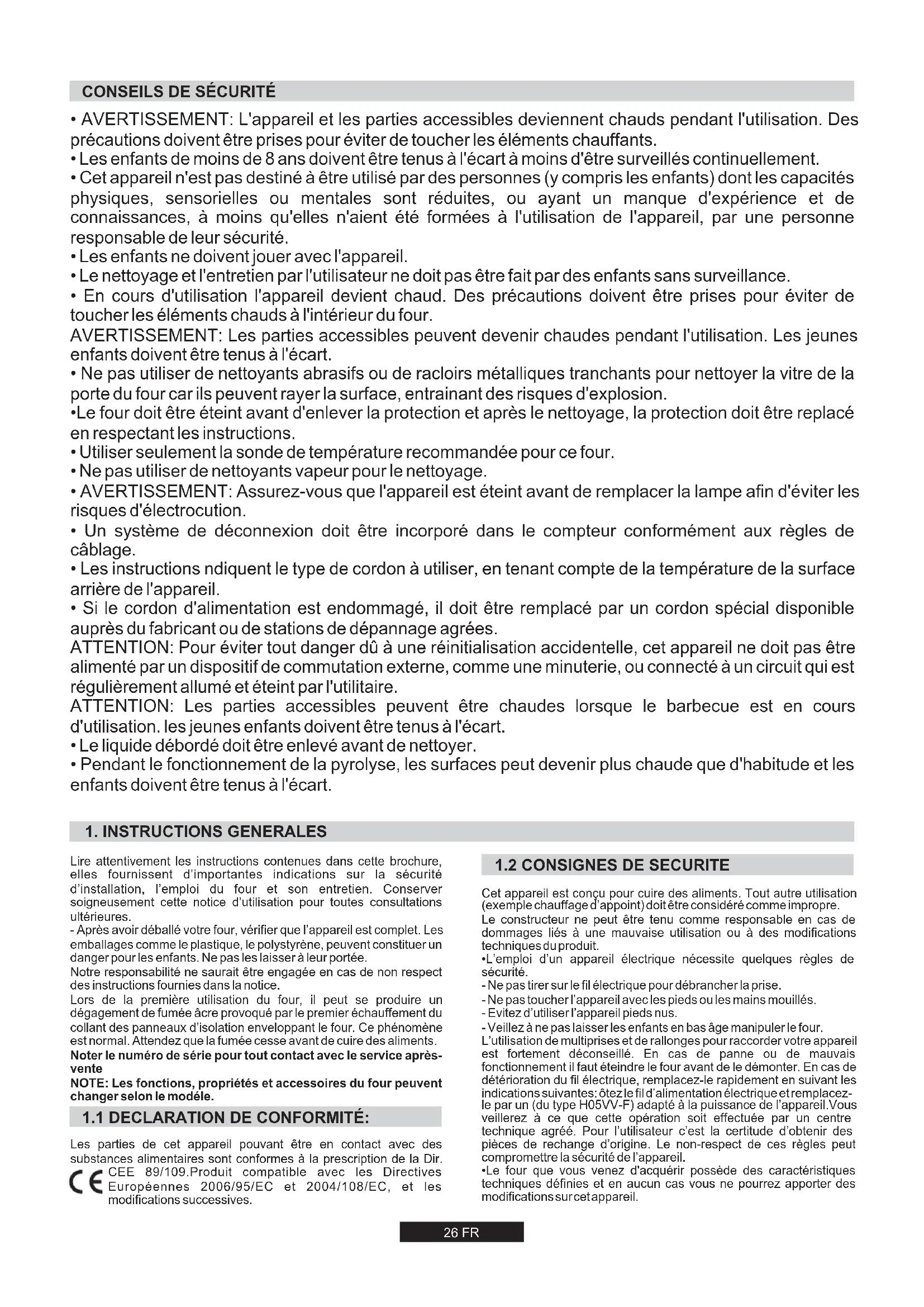 - L’emploi d’un appareil électrique nécessite quelques règles de sécurité. - Ne pas tirer sur le fil électrique pour débrancher la prise. - Ne pas toucher l’appareil avec les pieds ou les mains mouillés. - Evitez d’utiliser l’appareil pieds nus. - Veillez à ne pas laisser les enfants en bas âge manipuler le four. L’utilisation de multiprises et de rallonges pour raccorder votre appareil est fortement déconseillé. En cas de panne ou de mauvais fonctionnement il faut éteindre le four avant de le démonter. En cas de détérioration du fil électrique, remplacez-le rapidement en suivant les indications suivantes: ôtez le fil d’alimentation électrique et remplacez- le par un (du type H05VV-F) adapté à la puissance de l’appareil.Vous veillerez à ce que cette opération soit effectuée par un centre technique agréé. Pour l’utilisateur c’est la certitude d’obtenir des pièces de rechange d’origine. Le non-respect de ces règles peut compromettre la sécurité de l’appareil.