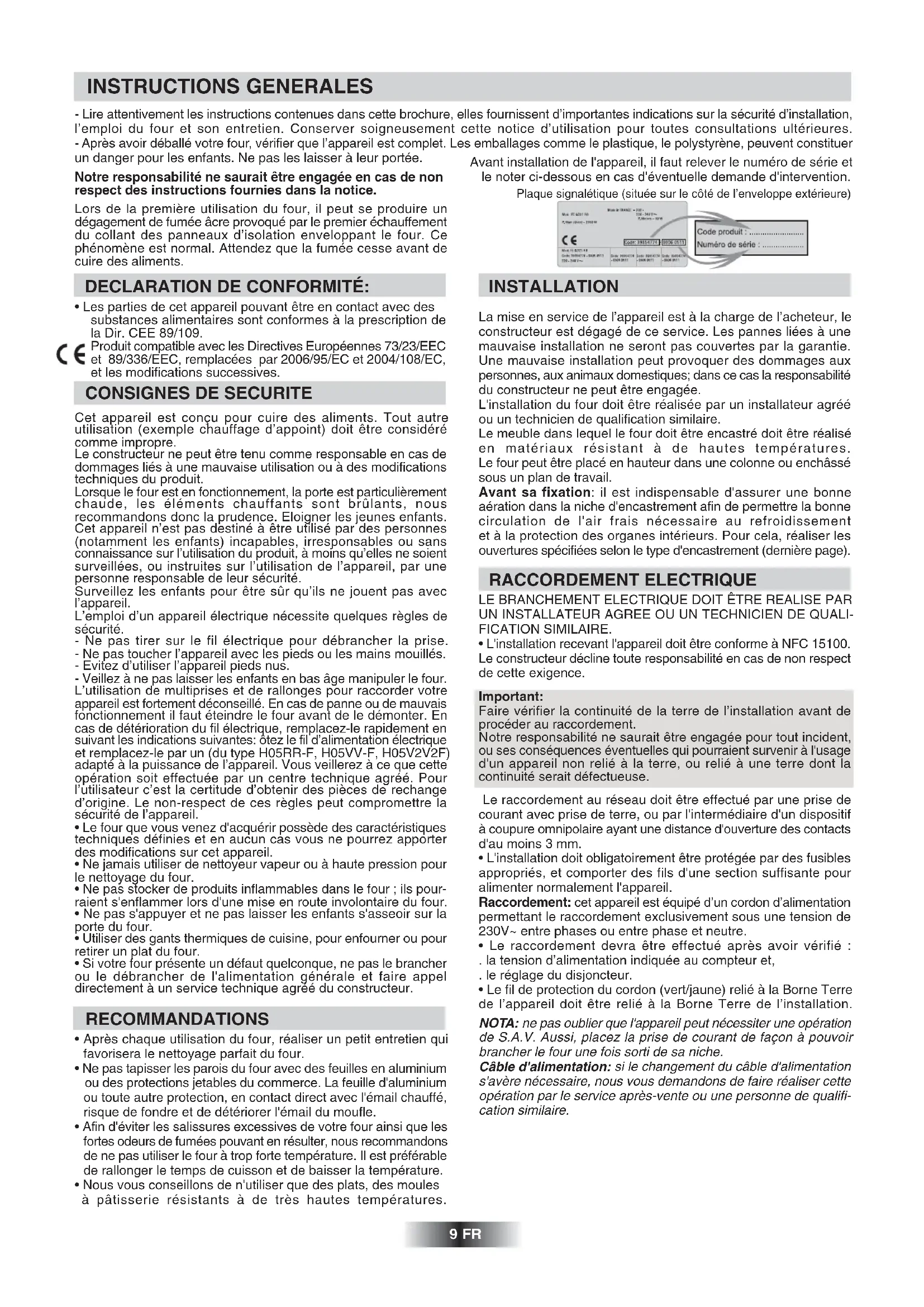 - Nous vous conseillons de n'utiliser que des plats, des moules à pâtisserie résistants à de très hautes températures. INSTALLATION La mise en service de l’appareil est à la charge de l’acheteur, le constructeur est dégagé de ce service. Les pannes liées à une mauvaise installation ne seront pas couvertes par la garantie. Une mauvaise installation peut provoquer des dommages aux personnes, aux animaux domestiques; dans ce cas la responsabilité du constructeur ne peut être engagée. L'installation du four doit être réalisée par un installateur agréé ou un technicien de qualification similaire. Le meuble dans lequel le four doit être encastré doit être réalisé en matériaux résistant à de hautes températures. Le four peut être placé en hauteur dans une colonne ou enchâssé sous un plan de travail. Avant sa fixation: il est indispensable d'assurer une bonne aération dans la niche d'encastrement afin de permettre la bonne circulation de l'air frais nécessaire au refroidissement et à la protection des organes intérieurs. Pour cela, réaliser les ouvertures spécifiées selon le type d'encastrement (dernière page). RACCORDEMENT ELECTRIQUE LE BRANCHEMENT ELECTRIQUE DOIT ÊTRE REALISE PAR UN INSTALLATEUR AGREE OU UN TECHNICIEN DE QUALI- FICATION SIMILAIRE.