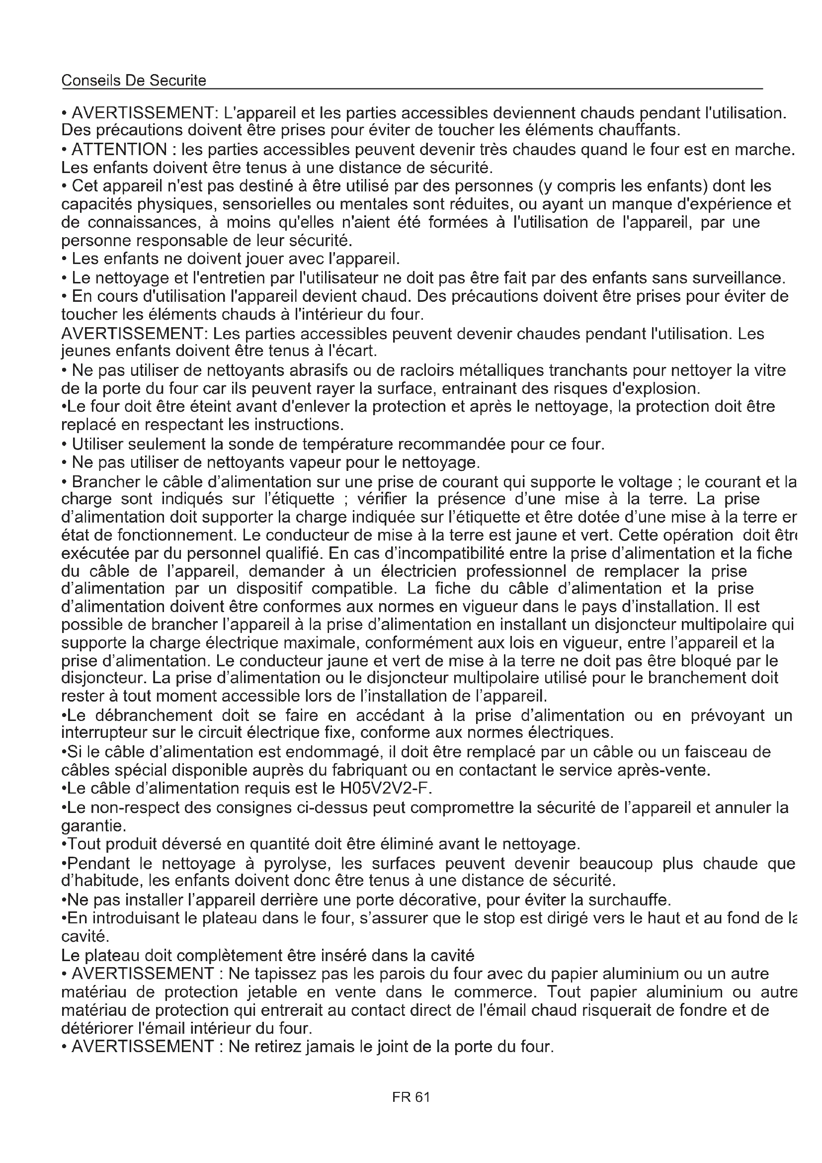 - AVERTISSEMENT : Ne retirez jamais le joint de la porte du four. Conseils De Securite FR 61Instructions Générales