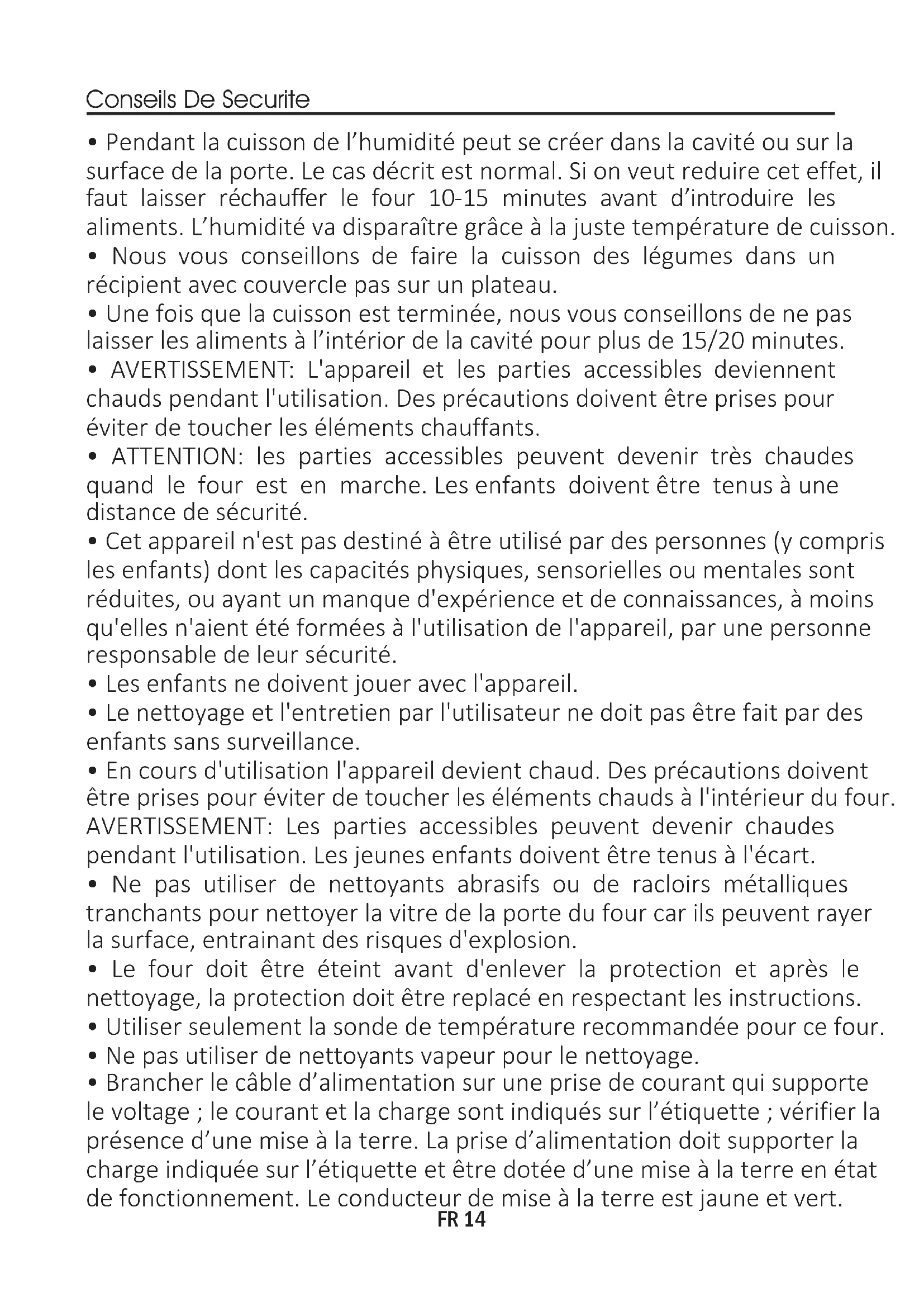 - Ne pas toucher l'appareil avec les mains ou les pieds mouillés ou humides;- En général l'utilisation d'adaptateurs, de prises multiples et de rallonges est déconseillé;Utilisez uniquement le four à sa destination, qui est seulement pour la cuisson des aliments; toute autre utilisation, par exemple comme une source de chaleur, est considérée comme inapproprié et donc dangereuse. Le fabricant ne peut être tenu responsable de tout dommage lié à une mauvaise utilisation ou a des modifications techniques du produit.- En cas de dysfonctionnement et / ou de mauvais fonctionnement, éteindre l'appareil et ne pas y toucher.L'utilisation de tout appareil électrique implique le respect de certaines règles fondamentales:- Ne pas tirer sur le fil électrique pour débrancher la prise.