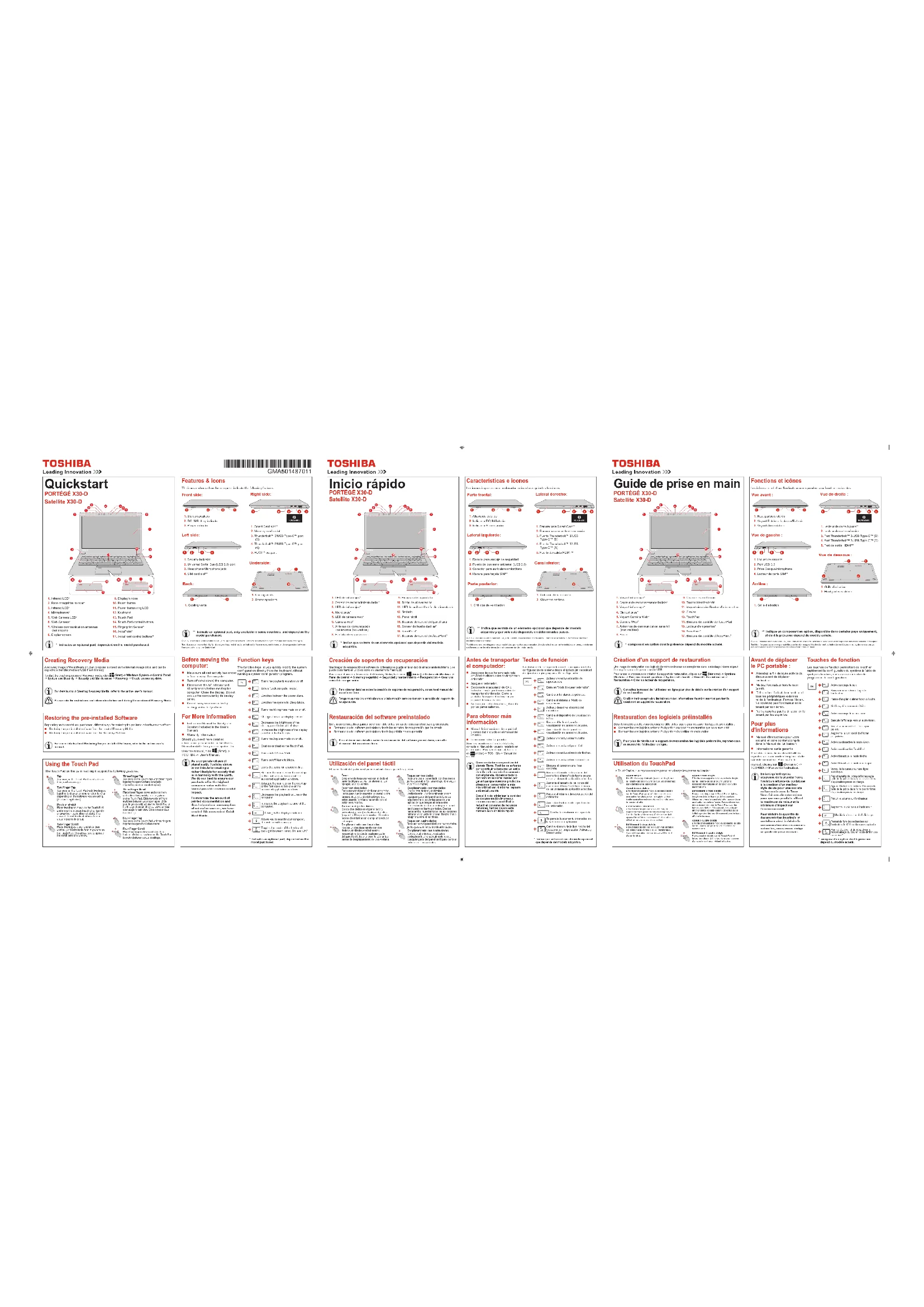 Satellite X30-D Avant de déplacer le PC portable : Attendez la fi n de toute activité dudisque avant de déplacerl’ordinateur. Mettez l’ordinateur hors tension(arrêt). Débranchez l’adaptateur secteur ettous les périphériques externesreliés à l’ordinateur. Fermez l’écran.Ne soulevez pas l’ordinateur en letenant par son écran. Ne transportez pas l’ordinateur en letenant par les aspérités. Pour plus d’informations Manuel d’instructions pour votresécurité et votre confort (comprisdans le Manuel de l’utilisateur) Informations sur la garantiePour des informations plus détaillées, reportez-vous au mode d’emploi installé sur vote ordinateur. Pour ouvrir le manuel, cliquez sur (Démarrer) -> TOSHIBA -> Manuel de l’utilisateur.En tant qu’entreprise citoyenne de la planète Terre, Toshiba s’efforce de contribuer à la création d’un meilleur style de vie pour une société en harmonie avec la Terre. Nous faisons de notre mieux pour que nos produits offrent le maximum de valeur et le minimum d’impact sur l’environnement.Pour réduire la quantité de documentation imprimée et contribuer ainsi à réduire la consommation des ressources naturelles, nous avons rédigé ce guide de prise en main. Touches de fonction Les touches de fonction permettent de modifi er rapidement la confi guration du système à l’aide de quelques touches, sans avoir à exécuter de programme de confi guration. Active ou coupe le son. Passe en mode Verrouillage de l’ordinateur. Passe d’un plan d’alimentation à l’autre. Met le système en mode Veille. Active ou coupe le microphone. Bascule l’affi chage vers un autre écran. Réduit la luminosité de l’écran par paliers. Augmente la luminosité de l’écran par paliers. Active ou désactive le mode Avion. Active ou désactive TouchPad. Active/désactive le mode fl èche. Active/désactive le mode numérique. Verrouille le curseur sur une ligne spécifi que. Réduit la taille de l’icône à l’écran ou la taille de la police dans l’une des fenêtres d’application prises en charge. Agrandit la taille de l’icône à l’écran ou la taille de la police dans l’une des fenêtres d’application prises en charge. Réduit le volume sur l’ordinateur. Augmente le volume sur l’ordinateur. Modifi e la résolution de l’affi chage. Permet de faire des recherches sur l’ordinateur, le Web ou dans une application.