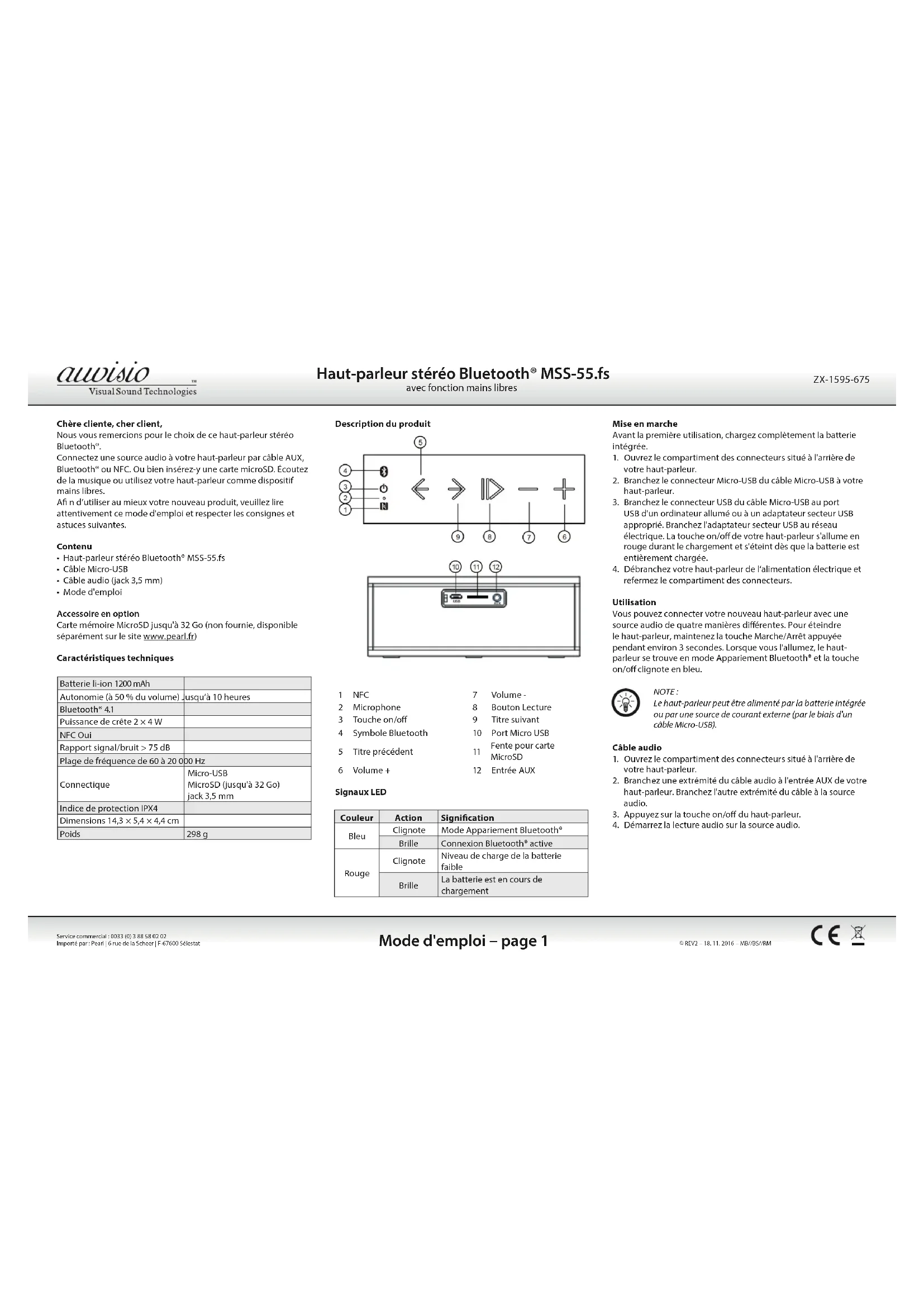 Haut-parleur stéréo Bluetooth® MSS-55.fs avec fonction mains libres Service commercial: 0033 (0) 3 88 58 02 02 Importé par: Pearl | 6 rue de la Scheer | F-67600 Sélestat Chère cliente, cher client, Nous vous remercions pour le choix de ce haut-parleur stéréo Bluetooth®. Connectez une source audio à votre haut-parleur par câble AUX, Bluetooth® ou NFC. Ou bien insérez-y une carte microSD. Écoutez de la musique ou utilisez votre haut-parleur comme dispositif mains libres. A n d’utiliser au mieux votre nouveau produit, veuillez lire attentivement ce mode d'emploi et respecter les consignes et astuces suivantes. Contenu