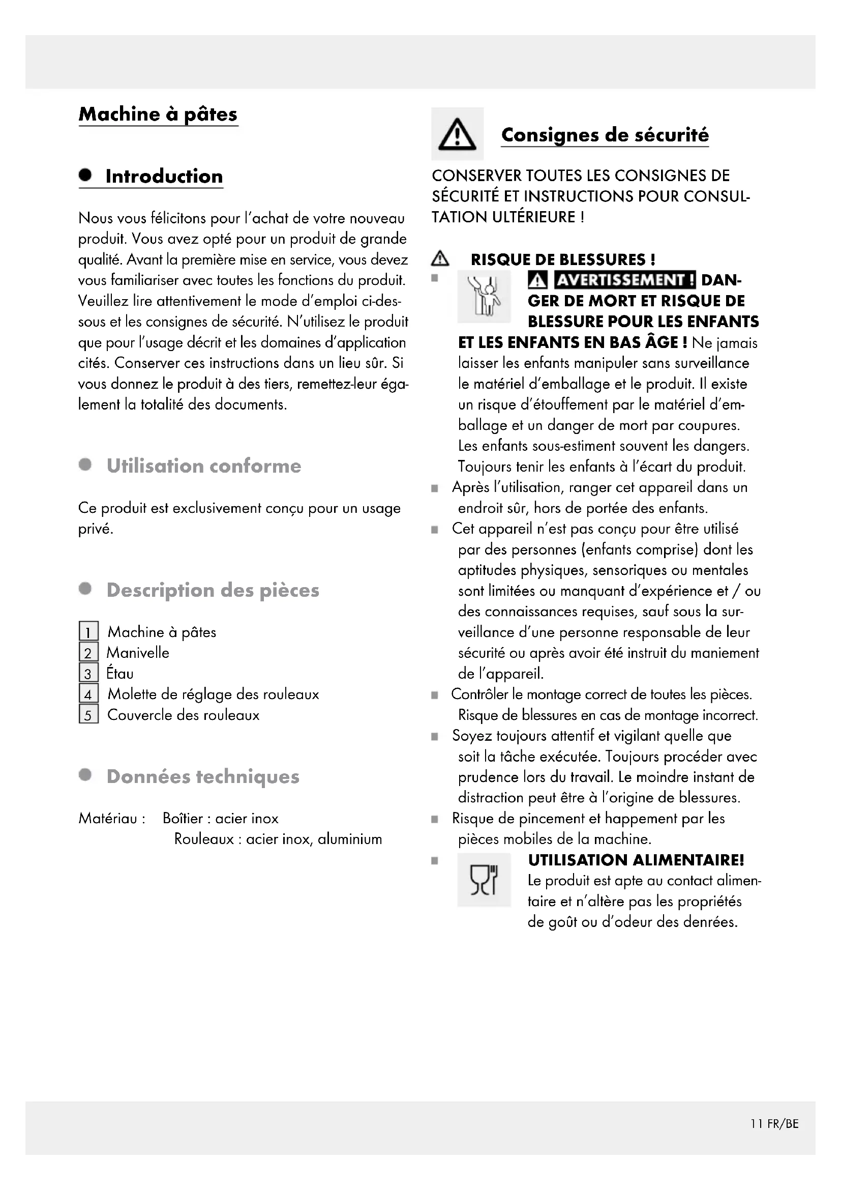 ET LES ENFANTS EN BAS ÂGE ! Ne jamais laisser les enfants manipuler sans surveillance le matériel d’emballage et le produit. Il existe un risque d’étouffement par le matériel d’em- ballage et un danger de mort par coupures. Les enfants sous-estiment souvent les dangers. Toujours tenir les enfants à l’écart du produit. Après l’utilisation, ranger cet appareil dans un endroit sûr, hors de portée des enfants. Cet appareil n’est pas conçu pour être utilisé par des personnes (enfants comprise) dont les aptitudes physiques, sensoriques ou mentales sont limitées ou manquant d’expérience et / ou des connaissances requises, sauf sous la sur- veillance d’une personne responsable de leur sécurité ou après avoir été instruit du maniement de l’appareil. Contrôler le montage correct de toutes les pièces. Risque de blessures en cas de montage incorrect. Soyez toujours attentif et vigilant quelle que soit la tâche exécutée. Toujours procéder avec prudence lors du travail. Le moindre instant de distraction peut être à l’origine de blessures. Risque de pincement et happement par les pièces mobiles de la machine. UTILISATION ALIMENTAIRE! Le produit est apte au contact alimen- taire et n’altère pas les propriétés de goût ou d’odeur des denrées.12 FR/BE Préparation Recette de base pour faire une pâte à pâtes italienne Ingrédients 300 g Farine (de préférence de blé dur) 130 ml d‘eau minérale naturelle ½ cuillère à café de sel
