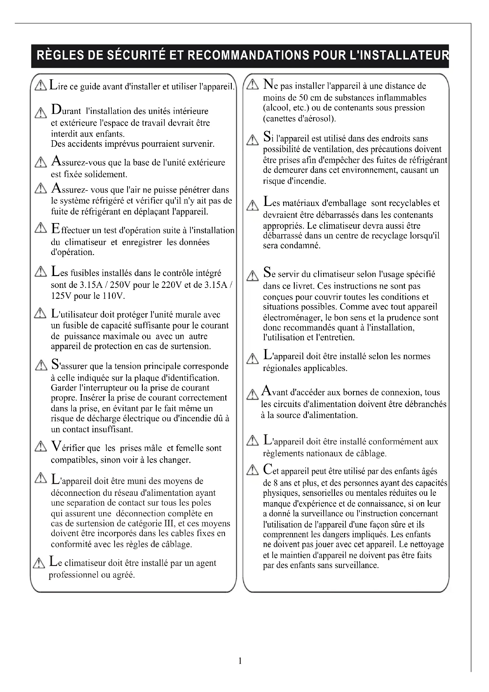 L'appareil doit être muni des moyens de déconnection du réseau d'alimentation ayant une separation de contact sur tous les poles qui assurent une déconnection complète en cas de surtension de catégorie III, et ces moyens doivent être incorporés dans les cables fixes en conformité avec les règles de câblage. L'appareil doit être installé conformément aux règlements nationaux de câblage. Le climatiseur doit être installé par un agent professionnel ou agréé. Cet appareil peut être utilisé par des enfants âgés de 8 ans et plus, et des personnes ayant des capacités physiques, sensorielles ou mentales réduites ou le manque d'expérience et de connaissance, si on leur a donné la surveillance ou l'instruction concernant l'utilisation de l'appareil d'une façon sûre et ils comprennent les dangers impliqués. Les enfants ne doivent pas jouer avec cet appareil. Le nettoyage et le maintien d'appareil ne doivent pas être faits par des enfants sans surveillance.RÈGLES DE SÉCURITÉ ET RECOMMANDATIONS POUR L'UTILISATEUR Ne pas entreprendre l'installation vous - même; toujours faire appel à du personnel technique qualifié. Le nettoyage et l'entretien doivent être effectués par du personnel technique qualifié.En tout cas, toujours couper l'alimentation en courant avant d'entreprendre tout nettoyage ou entretien. S'assurer que la tension corresponde à celle indiquée sur la plaque d'identification. Garder l'interrupteur ou la prise de courant propre. Insérer la prise de courant correctement dans la prise, en évitant par le fait même un risque de décharge électrique ou d'incendie dû à un contact insuffisant. Ne pas retirer la prise pour couper le courant lorsque l'appareil est en fonction, cela pourrait causer une étincelle et causer un risque d'incendie, etc. Si l'appareil dégage de la fumée ou s'il y a une senteur de chauffé, coupez le courant immédiatement et appelez un centre de service. Faites effectuer la réparation par un centre de service autorisé du manufacturier . Une réparation inefficace pourrait causer un risque de décharge électrique, etc. L'utilisation prolongée de l'appareil dans de telles circonstances pourrait causer un incendie ou une électrocution. Ne jamais demeurer directement dans le courant d'air frais durant une période prolongée. Une exposition directe et prolongée pourrait nuire à votre santé. Un soin particulier devrait être apporté dans les pièces où il y a des enfants, des personnes âgées ou malades. Cet appareil a été conçu pour climatiser un environnement résidentiel et ne doit pas être utilisé à d'autres fins, telles que le séchage de vêtements, réfrigération des aliments, etc. Les matériaux d'emballage sont recyclables et devraient être débarrassés dans les contenants appropriés. Le climatiseur devra aussi être débarrassé dans un centre de recyclage lorsqu'il sera condamné. Toujours utiliser le climatiseur avec le filtre à air en place. L'utilisation sans le filtre à air pourrait causer une accumulation excessive de poussière et autres résidus sur les composantes internes résultant en pannes subséquentes. L'utilisateur doit s'assurer que l'appareil soit installé par un technicien qualifié qui doit, en retour , s'assurer de la mise à terre de l'appareil en accord avec la législation courante et doit installer un coupe-circuit ou disjoncteur. Se servir du climatiseur selon l'usage spécifié dans ce livret. Ces instructions ne sont pas conçues pour couvrir toutes les conditions et situations possibles. Comme avec tout appareil électroménager, le bon sens et la prudence sont donc recommandés quant à l'installation, l'utilisation et l'entretien. Débrancher l'interrupteur automatique si vous prévoyez ne pas utiliser l'appareil durant une période prolongée. La direction de l'air doit être ajustée conve- nablement. Les ailettes doivent être dirigées vers le bas en mode chauffage et vers le haut en mode climatisation. S'assurer que l'appareil est débranché s'il doit être hors d'usage pendant une période prolongée et avant de procéder à un nettoyage ou un entretien. La sélection de la température la plus appropriée peut empêcher de causer des dommages à l'appareil. Les piles de la télécommande doivent être recyclées ou jetées de façon appropriée. Elimination des piles utilisées---Jetez les piles selon la procédure de tri des déchets de votre municipalité aux points de collecte accessibles. 2RÈGLES DE SÉCURITÉ ET INTERDICTIONS Ne pas plier, tirer ou écraser le cordon d'ali- mentation car cela pourrait l'endommager. Les décharges électriques et les incendies sont habituellement causés par un cordon endommagé . Seul un technicien qualifié devrait se charger de remplacer un cordon d'alimentation endommagé. Ne pas utiliser de rallonge ou de prise multiple. Ne pas toucher à l'appareil lorsque pieds nus ou si des parties de votre corps sont mouillées ou humides. Ne pas obstruer l'entrée ou la sortie d'air de l'unité murale ou de l'unité extérieure. L'obstruction de ces ouvertures pourrait causer une diminution de l'efficacité du climatiseur avec une possibilité de pannes subséquentes. En aucun cas altérer les caractéristiques de l'appareil. Ne pas installer l'appareil dans un environne- ment pouvant contenir de l'essence, de l'huile ou du soufre ou près d'une source de chaleur. Ne pas grimper, placer des objets lourds ou chauds sur le dessus de l'appareil. Ne pas laisser portes ou fenêtres ouvertes durant une période prolongée lorsque le climatiseur est en marche. Ne pas diriger l'air directement sur des plantes ou des animaux. Une exposition directe prolongée à l'air froid du climatiseur pourrait avoir un effetnégatif sur des plantes ou des animaux. Ne pas mettre le climatiseur en contact avec de l'eau. L'isolant électrique pourrait être endommagé et causer un risque d'électrocution. Ne pas grimper ou placer des objets sur l'