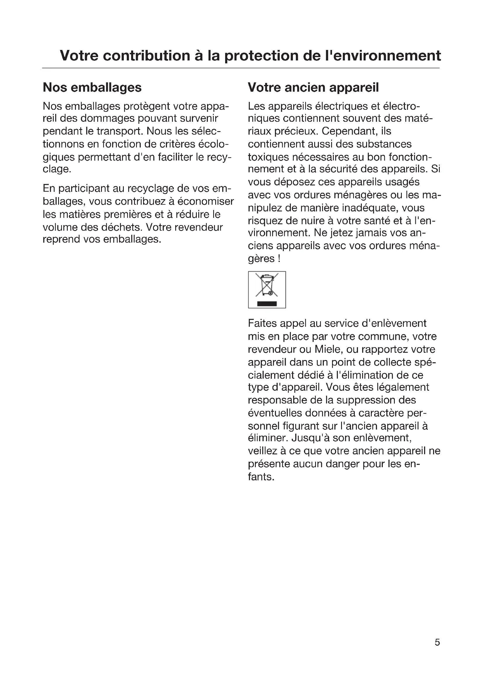 Nos emballages Nos emballages protègent votre appa- reil des dommages pouvant survenir pendant le transport. Nous les sélec- tionnons en fonction de critères écolo- giques permettant d'en faciliter le recy- clage. En participant au recyclage de vos em- ballages, vous contribuez à économiser les matières premières et à réduire le volume des déchets. Votre revendeur reprend vos emballages. Votre ancien appareil Les appareils électriques et électro- niques contiennent souvent des maté- riaux précieux. Cependant, ils contiennent aussi des substances toxiques nécessaires au bon fonction- nement et à la sécurité des appareils. Si vous déposez ces appareils usagés avec vos ordures ménagères ou les ma- nipulez de manière inadéquate, vous risquez de nuire à votre santé et à l'en- vironnement. Ne jetez jamais vos an- ciens appareils avec vos ordures ména- gères! Faites appel au service d'enlèvement mis en place par votre commune, votre revendeur ou Miele, ou rapportez votre appareil dans un point de collecte spé- cialement dédié à l'élimination de ce type d'appareil. Vous êtes légalement responsable de la suppression des éventuelles données à caractère per- sonnel figurant sur l'ancien appareil à éliminer. Jusqu'à son enlèvement, veillez à ce que votre ancien appareil ne présente aucun danger pour les en- fants.Consignes de sécurité et mises en garde
