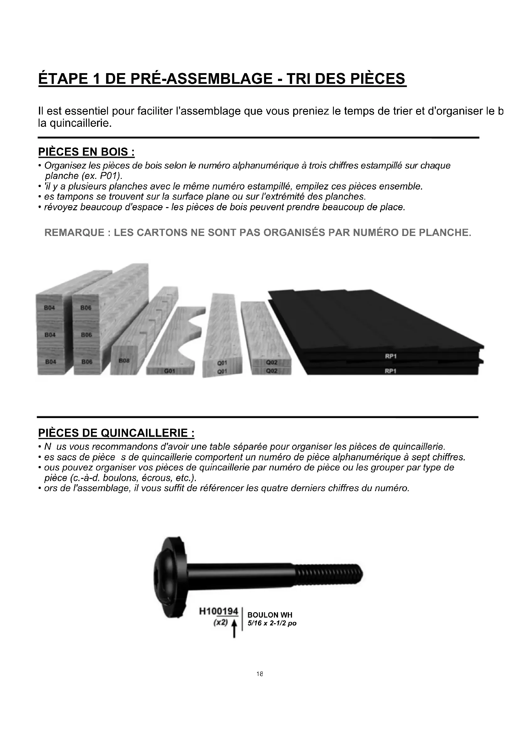 - ors de l'assemblage, il vous suffit de référencer les quatre derniers chiffres du numéro. BOULON WH 5/16 x 2-1/2 po ÉTAPE 1 DE PRÉ-ASSEMBLAGE - TRI DES PIÈCES 1818ÉTAPE 2 DE PRÉ-ASSEMBLAGE - OUTILS NÉCESSAIRES Accessoires de la perceuse : Tête cruciforme Clés ouvertes de 1/2 po et 9/16 po Mèches de 1/8 po, 3/16 po, 3/8 po et 7/16 po Clé à cliquet de 3/8 po, douilles standard de 1/2 po et 9/16 po, douilles profondes de 1/2 po et 7/16 po Tournevis cruciforme Perceuse sans fil ou perceuse électrique Marteau à panne fendue Maillet en caoutchouc - En option Niveau de 24 po Équerre Mètre à ruban 19Plusieurs types d'instructions de montage s'offrent à vous.
