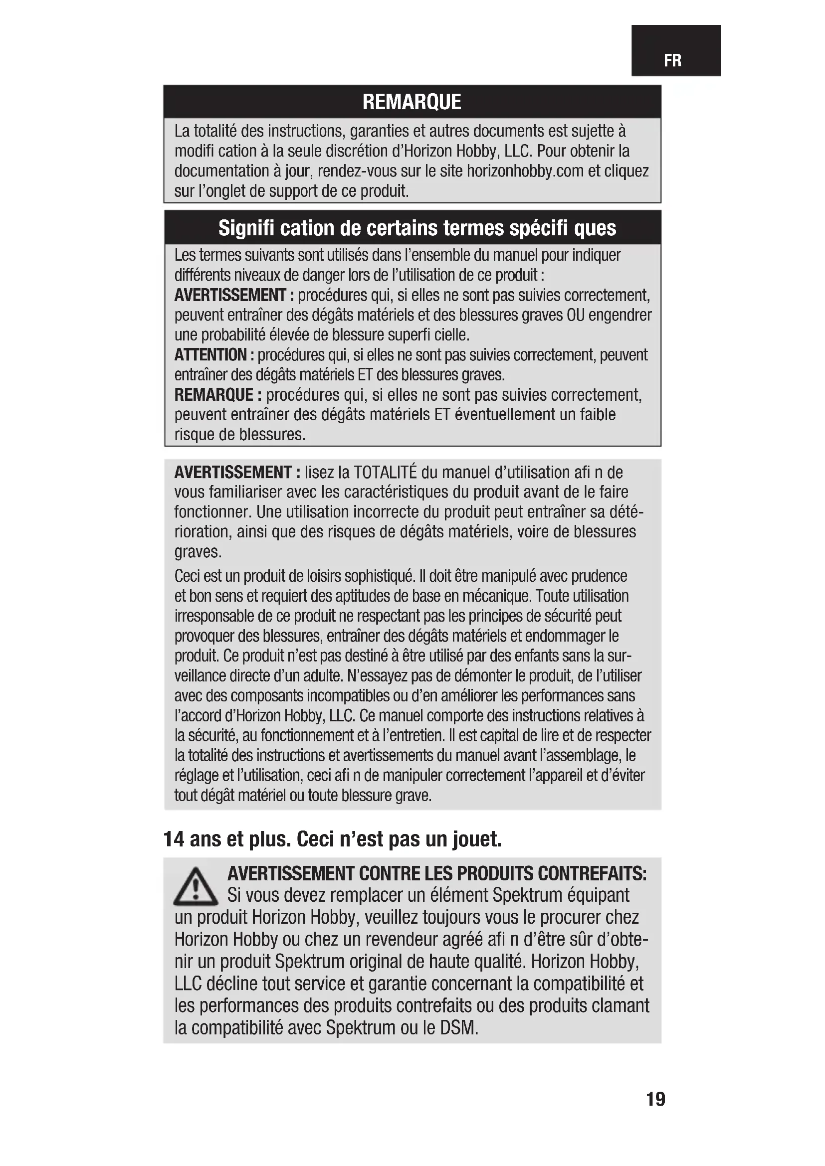 peuvent entraîner des dégâts matériels et des blessures graves OU engendrer une probabilité élevée de blessure superfi cielle. ATTENTION: procédures qui, si elles ne sont pas suivies correctement, peuvent entraîner des dégâts matériels ET des blessures graves. REMARQUE: procédures qui, si elles ne sont pas suivies correctement, peuvent entraîner des dégâts matériels ET éventuellement un faible risque de blessures. REMARQUE La totalité des instructions, garanties et autres documents est sujette à modifi cation à la seule discrétion d’Horizon Hobby, LLC. Pour obtenir la documentation àjour, rendez-vous sur le site horizonhobby.com et cliquez sur l’onglet de support de ce produit. Signifi cation de certains termes spécifi ques AVERTISSEMENT CONTRE LES PRODUITS CONTREFAITS: Si vous devez remplacer un élément Spektrum équipant un produit Horizon Hobby, veuillez toujours vous le procurer chez Horizon Hobby ou chez un revendeur agréé afi n d’être sûr d’obte- nir un produit Spektrum original de haute qualité. Horizon Hobby, LLC décline tout service et garantie concernant la compatibilité et les performances des produits contrefaits ou des produits clamant la compatibilité avec Spektrum ou le DSM.FR