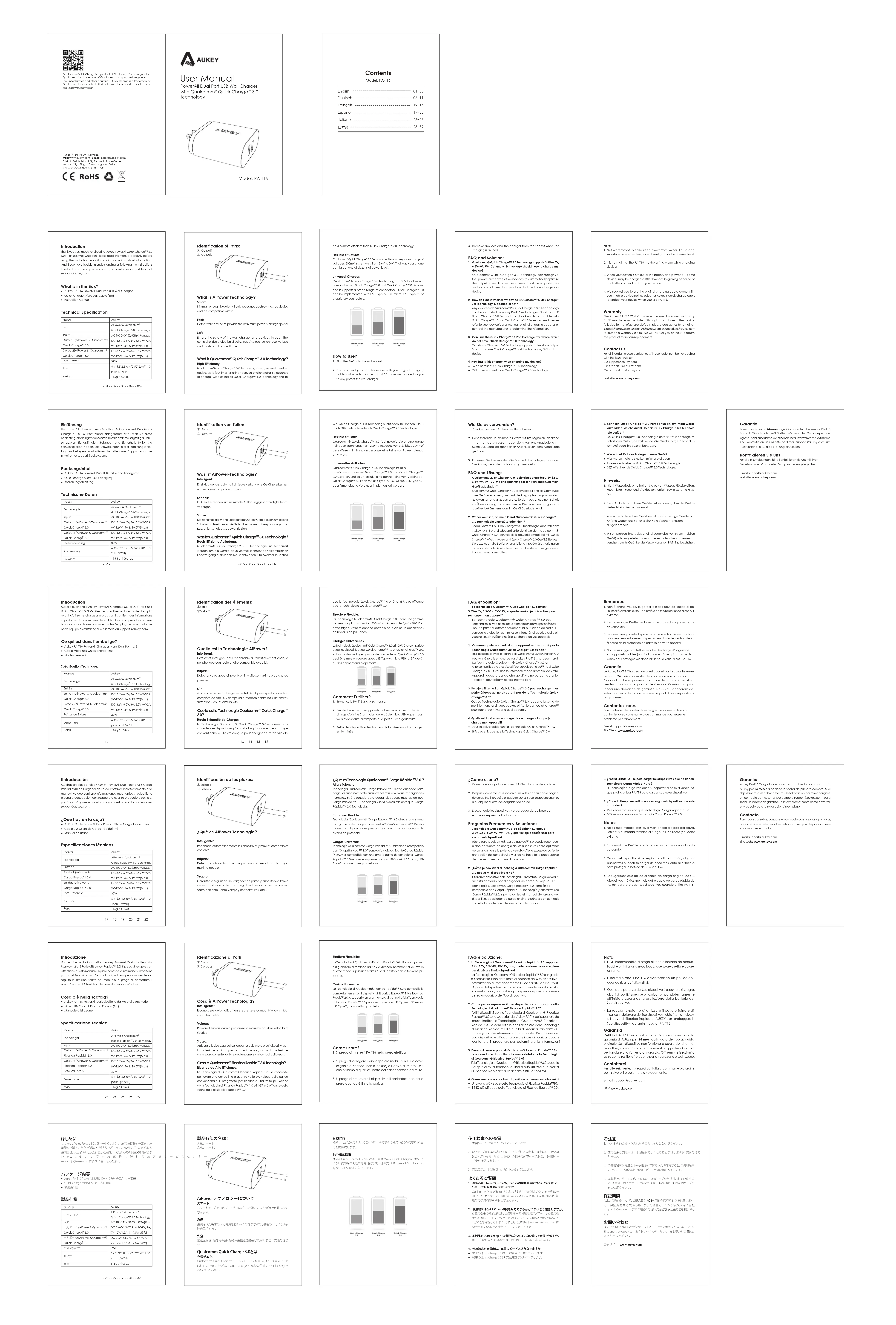 Gerät(nicht mitgeliefert)oder schnelles Ladekabel von Aukey zu benutzen, um Ihr Gerät bei der Verwendung von PA-T16 zu beschützen. Garantie Aukey bietet eine 24-monatige Garantie für das Aukey PA-T16 PowerAll Wand-Ladegerät. Sollten während der Garantieperiode jegliche Fehler auftauchen, die auf einen Produktionsfehler zurückzuführen sind, kontaktieren Sie uns bitte per Email: support@aukey.com, um Rückversand, bzw. die Erstattung einzuleiten. Kontaktieren Sie uns Für alle Erkundigungen, bitte kontaktieren Sie uns mit Ihrer Bestellnummer für schnelle Lösung zu der Angelegenheit. E-mail:support@aukey.com Website: www.aukey.com- 12 -- 13 - - 14 - - 15 - - 16 - Introduction Merci d'avoir choisi Aukey PowerAll Chargeur Mural Dual Ports USB Quick Charge™ 3.0! Veuillez lire attentivement ce mode d’emploi avant d'utiliser le chargeur mural, car il contient des informations importantes. Et si vous avez de la difficulté à comprendre ou suivre les instructions indiquées dans ce mode d’emploi, merci de contacter notre équipe d'assistance à la clientèle au support@aukey.com. Ce qui est dans l’emballge? ● Aukey PA-T16 PowerAll Chargeur Mural Dual Ports USB ● Câble Micro USB Quick charge(1m) ● Mode d’emploi Identification des éléments: ①Sortie 1 ②Sortie 2 Quelle est la Technologie AiPower? Intelligent: Il est assez intelligent pour reconnaître automatiquement chaque périphérique connecté et être compatible avec lui. Rapide: Détecter votre appareil pour fournir la vitesse maximale de charge possible.Sûr: Assurer la sécurité du chargeur mural et des dispositifs par la protection complète de circuit, y compris la protection contre les surintensités, surtensions, courts-circuits, etc. Quelle est la Technologie Qualcomm® Quick Charge™ 3.0? Haute Efficacité de Charge: La Technologie Qualcomm® Quick Charge™ 3.0 est créée pour alimenter des dispositifs jusqu'à quatre fois plus rapide que la charge conventionnelle. Elle est conçue pour charger deux fois plus vite que la Technologie Quick Charge™ 1.0 et être 38% plus efficace que la Technologie Quick Charge™ 2.0. Structure Flexible: La Technologie Qualcomm® Quick Charge™ 3.0 offre une gamme de tensions plus granulaire, 200mV incréments de 3,6V à 20V. De cette façon, votre téléphone portable peut cibler un des dizaines de niveaux de puissance. Charges Universelles: La Technologie Qualcomm® Quick Charge™ 3.0 est 100% rétro-compatible avec les dispositifs avec Quick Charge™ 1.0 et Quick Charge™ 2.0, et il supporte une large gamme de connecteurs: Quick Charge™ 3.0 peut être mise en oeuvre avec USB Type-A, micro USB, USB Type-C, ou des connecteurs propriétaires. Comment l’utiliser?