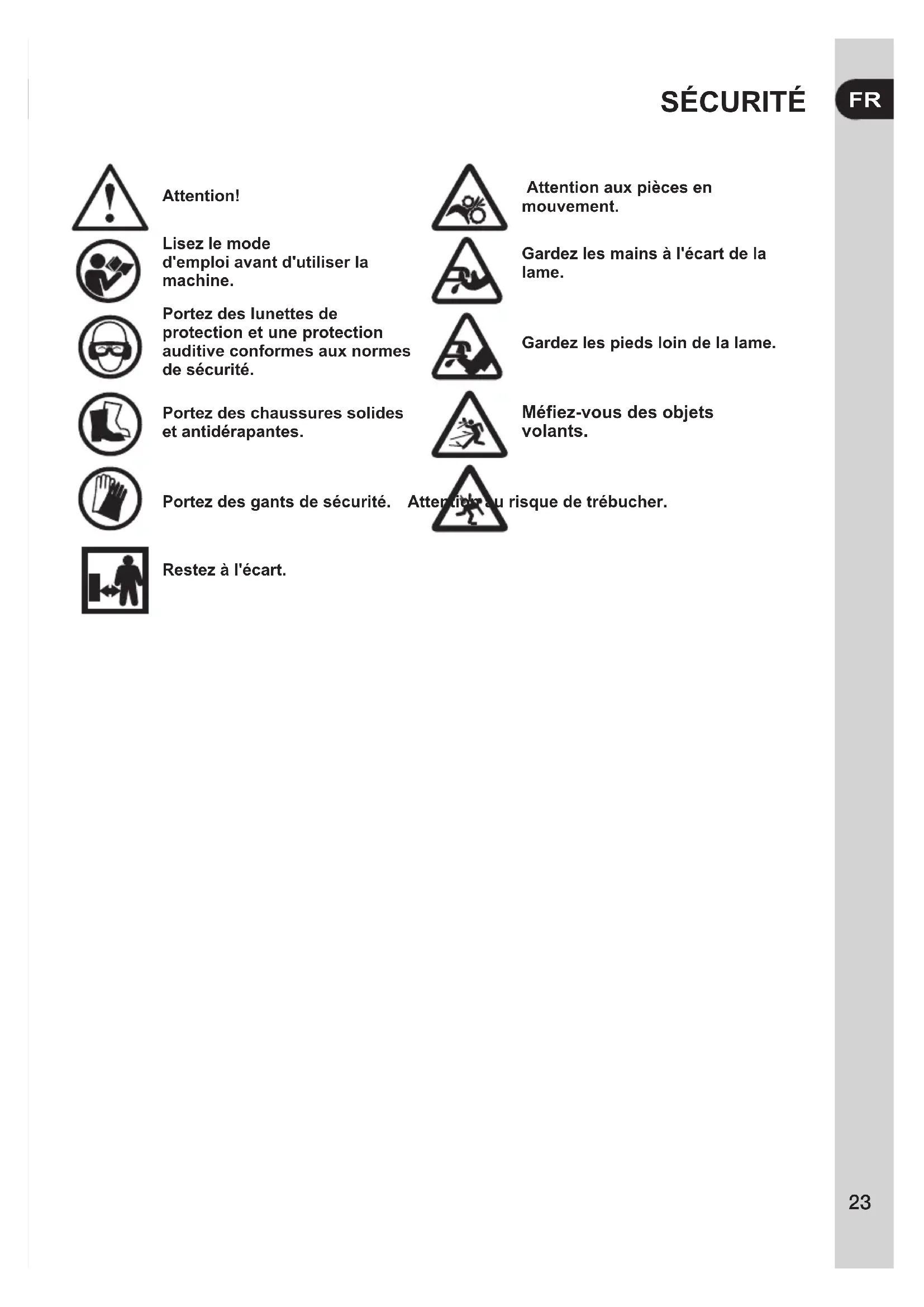 22SÉCURITÉ Attention! Attentionauxpiècesen mouvement. Lisezlemode d'emploiavantd'utiliserla machine. Gardezlesmainsàl'écartdela lame. Portezdeslunettesde protection et une protection auditiveconformesauxnormes desécurité. Gardezlespiedsloindelalame. Portezdeschaussuressolides etantidérapantes. Méfiez-vousdesobjets volants. Portezdesgantsdesécurité. Attentionaurisquedetrébucher. Restezàl'écart.