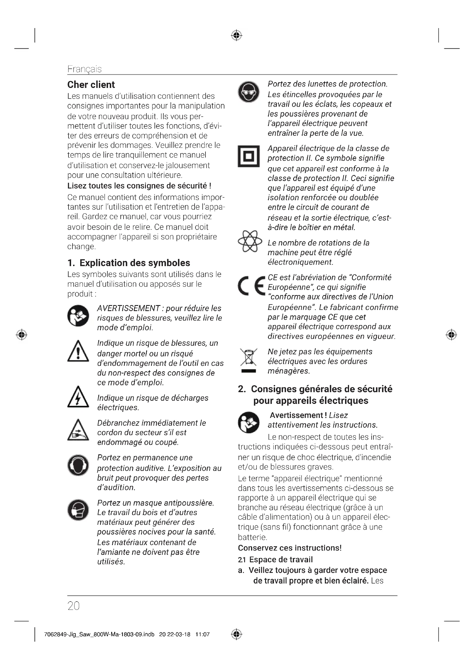 a. Restez vigilant, gardez un œil sur ce que vous faites et utilisez votre sens commun lors de l’utilisation d’un appa- reil électrique. N’utilisez pas un appa- reil électrique si vous êtes fatigué ou si vous êtes sous l’influence de dro- gues, d’alcool ou si vous prenez des médicaments. Un moment d’inatten- tion lors de l’utilisation des appareils électriques peut entraîner des blessures graves. b. Utilisez des équipements de protec- tion. Protégez-vous toujours les yeux. Les équipements de protection, tels qu’un masque à poussière, des chaus- sures antidérapantes, des protections auditives ou un casque de sécurité, utilisés dans de bonnes conditions, réduiront le risque de blessures. c. Évitez tout démarrage involontaire. Assurez-vous que l’interrupteur est sur la position “arrêt avant de bran- cher l’appareil. En effet, le transport des appareils électriques en gardant vos doigts sur l’interrupteur, ou le bran- chement de ces appareils en ayant l’interrupteur sur “marche” est source d’accidents. d. Retirez les clés de réglage ou les clés de vis de réglage avant d’allumer l’ap- pareil électrique. Une clé de vis de réglage ou une clé, laissée sur une pièce en mouvement de l’appareil électrique, peut entraîner des lésions corporelles. e. Ne vous surélevez pas. Gardez tou- jours vos pieds à plat et gardez votre équilibre. Ceci permet de mieux contrô- ler l’appareil électrique dans des situa- tions imprévues. 7062849-Jig_Saw_800W-Ma-1803-09.indb 21 22-03-18 11:07Français