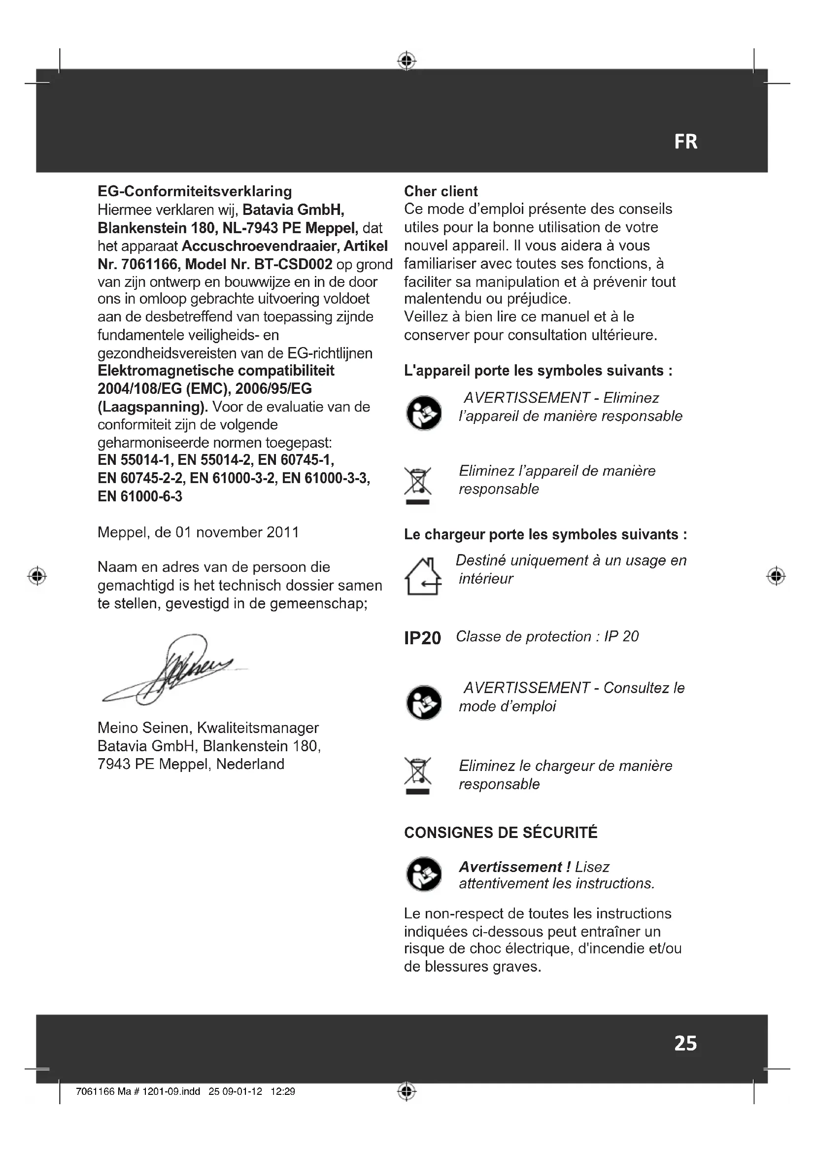 N’éliminez pas les appareils électriques via les ordures ménagères. L’appareil électrique se trouve dans un emballage an d’éviter tout dommage pendant le transport. Cet emballage est une matière première et peut donc être réutilisé ultérieurement ou être réintroduit dans le circuit des matières premières. L’appareil électrique et ses accessoires sont composés de plusieurs matériaux, par exemple des métaux et des matières plastiques. Éliminez les composants défectueux via les systèmes d’élimination des déchets spéciaux. Renseignez-vous dans un magasin spécialisé ou auprès de l’administration de votre commune! Le produit et le manuel utilisateur peuvent être modiés. Les caractéristiques techniques peuvent être modiées sans préavis. CE-Déclaration de conformité Nous, Batavia GmbH, Blankenstein 180, NL-7943 PE Meppel, déclarons sous notre seule responsabilité que le produit Tournevis sans l, article no. 7061166, modèle BT-CSD002, satisfait les principales exigences de protection dénies dans les directives européennes compatibilité électromagnétique 2004/108/CE (CEM), 2006/42/CE (machines) et 2006/95/CE (basse tension) ainsi que les modications y apportées. Pour évaluer la conformité nous avons eu recours aux normes harmonisées ci-dessous: EN 55014-1, EN 55014-2, EN 60745-1, EN 60745-2-2, EN 61000-3-2, EN 61000-3-3, EN 61000-6-3 Meppel, le 01 novembre 2011 Nom et adresse de la personne autorisée à constituer le dossier technique, qui doit être établi dans la communauté; Meino Seinen, Responsable de qualité Batavia GmbH, Blankenstein 180, 7943 PE Meppel, Pays-Bas 7061166 Ma # 1201-09.indd 32 09-01-12 12:2933
