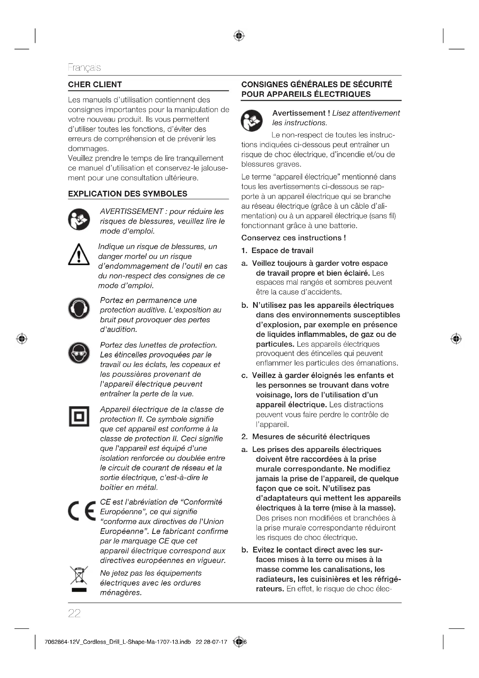 a. Les prises des appareils électriques doivent être raccordées à la prise murale correspondante. Ne modiez jamais la prise de l’appareil, de quelque façon que ce soit. N’utilisez pas d’adaptateurs qui mettent les appareils électriques à la terre (mise à la masse). Des prises non modiées et branchées à la prise murale correspondante réduiront les risques de choc électrique. b. Evitez le contact direct avec les sur- faces mises à la terre ou mises à la masse comme les canalisations, les radiateurs, les cuisinières et les réfrigé- rateurs. En effet, le risque de choc élec- 7062864-12V_Cordless_Drill_L-Shape-Ma-1707-13.indb 22 28-07-17 11:1623 Français