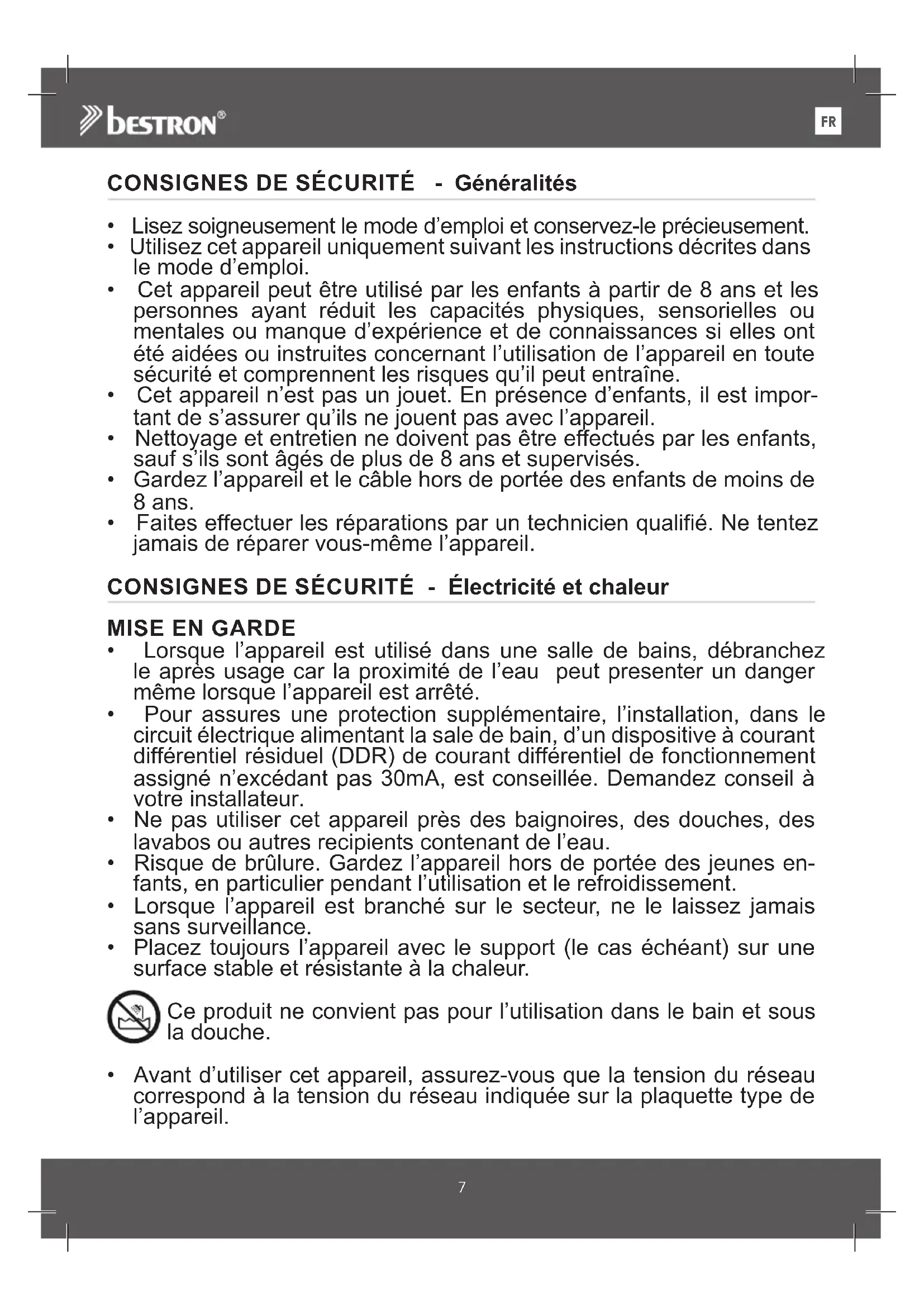 - Lorsque l’appareil est utilisé dans une salle de bains, débranchez le après usage car la proximité de l’eau peut presenter un danger même lorsque l’appareil est arrêté.