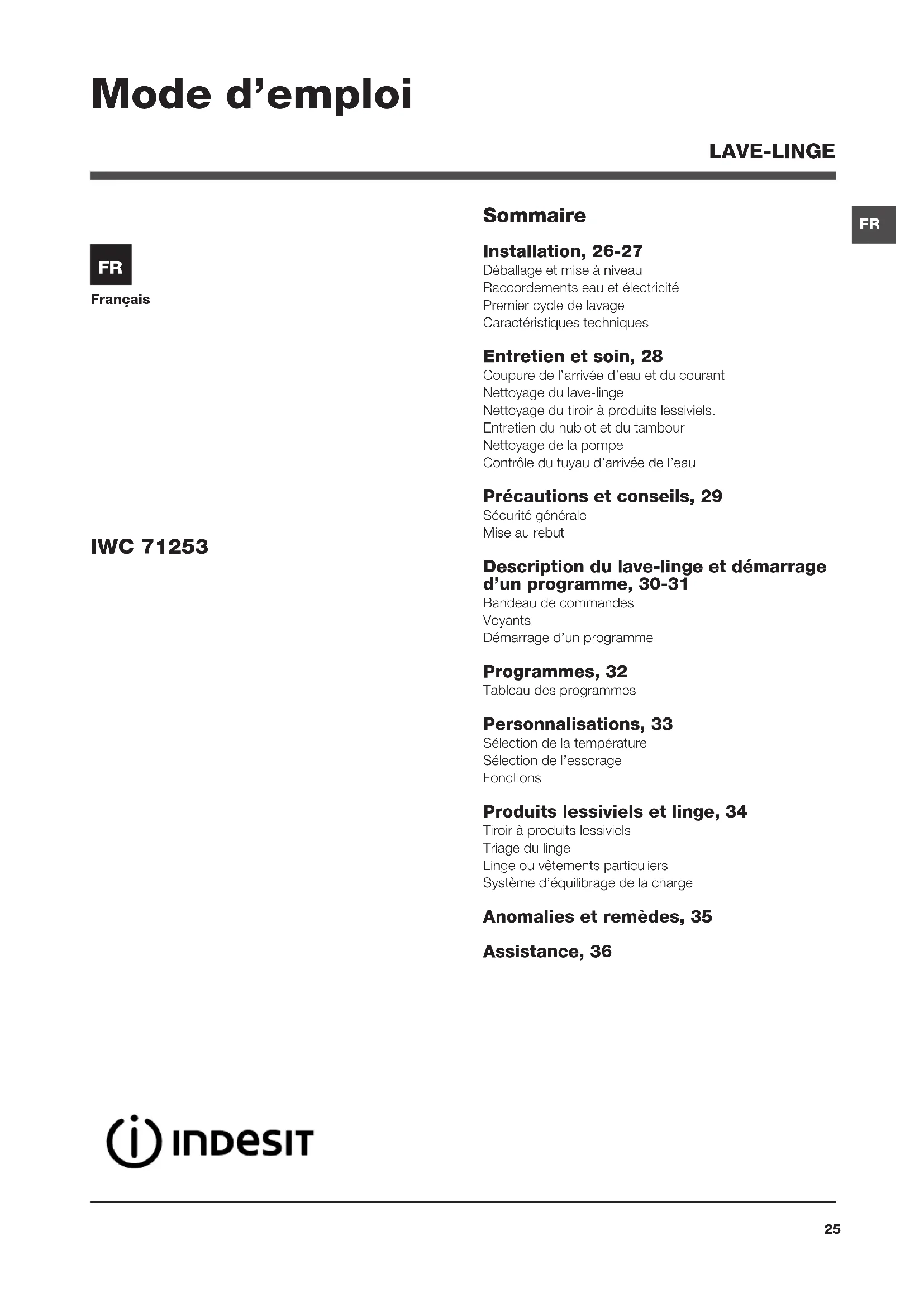 IWC 71253 Mode d’emploi LAVE-LINGE Sommaire Installation, 26-27 Déballage et mise à niveau Raccordements eau et électricité Premier cycle de lavage Caractéristiques techniques Entretien et soin, 28 Coupure de l’arrivée d’eau et du courant Nettoyage du lave-linge Nettoyage du tiroir à produits lessiviels. Entretien du hublot et du tambour Nettoyage de la pompe Contrôle du tuyau d’arrivée de l’eau Précautions et conseils, 29 Sécurité générale Mise au rebut Description du lave-linge et démarrage d’un programme, 30-31 Bandeau de commandes Voyants Démarrage d’un programme Programmes, 32 Tableau des programmes Personnalisations, 33 Sélection de la température Sélection de l’essorage Fonctions Produits lessiviels et linge, 34 Tiroir à produits lessiviels Triage du linge Linge ou vêtements particuliers Système d’équilibrage de la charge Anomalies et remèdes, 35 Assistance, 3626