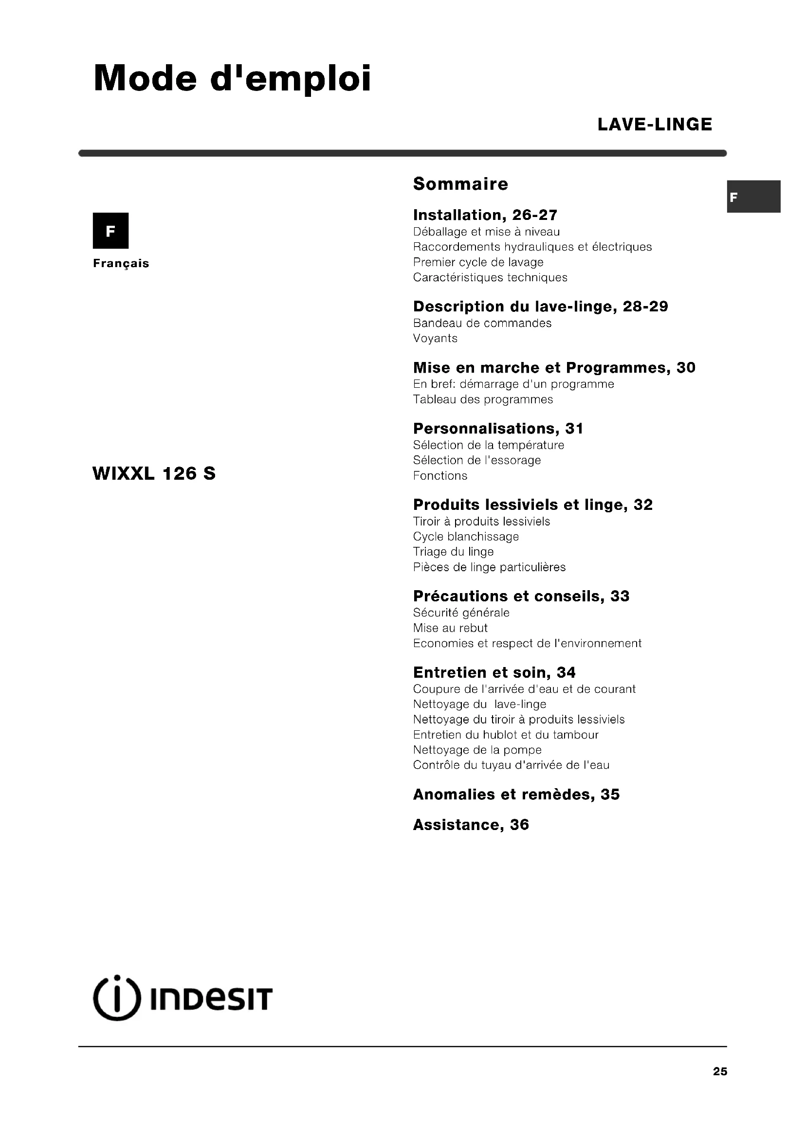 Français Sommaire Installation, 26-27 Déballage et mise à niveau Raccordements hydrauliques et électriques Premier cycle de lavage Caractéristiques techniques Description du lave-linge, 28-29 Bandeau de commandes Voyants Mise en marche et Programmes, 30 En bref: démarrage d'un programme Tableau des programmes Personnalisations, 31 Sélection de la température Sélection de l'essorage Fonctions Produits lessiviels et linge, 32 Tiroir à produits lessiviels Cycle blanchissage Triage du linge Pièces de linge particulières Précautions et conseils, 33 Sécurité générale Mise au rebut Economies et respect de l'environnement Entretien et soin, 34 Coupure de l'arrivée d'eau et de courant Nettoyage du lave-linge Nettoyage du tiroir à produits lessiviels Entretien du hublot et du tambour Nettoyage de la pompe Contrôle du tuyau d'arrivée de l'eau Anomalies et remèdes, 35 Assistance, 36 LAVE-LINGE WIXXL 126 S Mode d'emploi F26