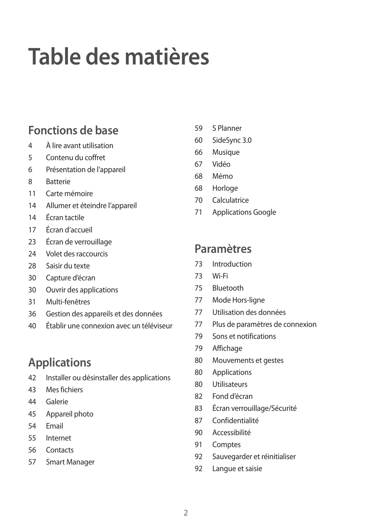 À lire avant utilisation Contenu du coffret Présentation de l’appareil Batterie Carte mémoire Allumer et éteindre l’appareil Écran tactile Écran d’accueil Écran de verrouillage Volet des raccourcis Saisir du texte Capture d’écran Ouvrir des applications Multi-fenêtres Gestion des appareils et des données Établir une connexion avec un téléviseur Paramètres