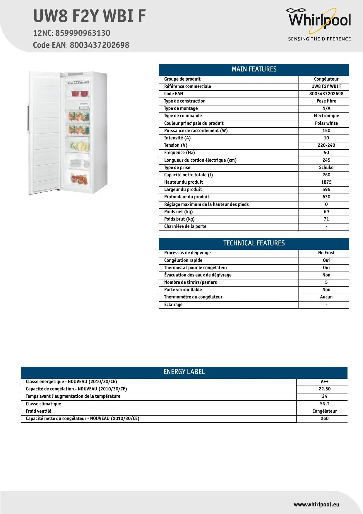 UW8F2YWBIF - Réfrigérateur WHIRLPOOL - Notice d'utilisation et mode d'emploi gratuit