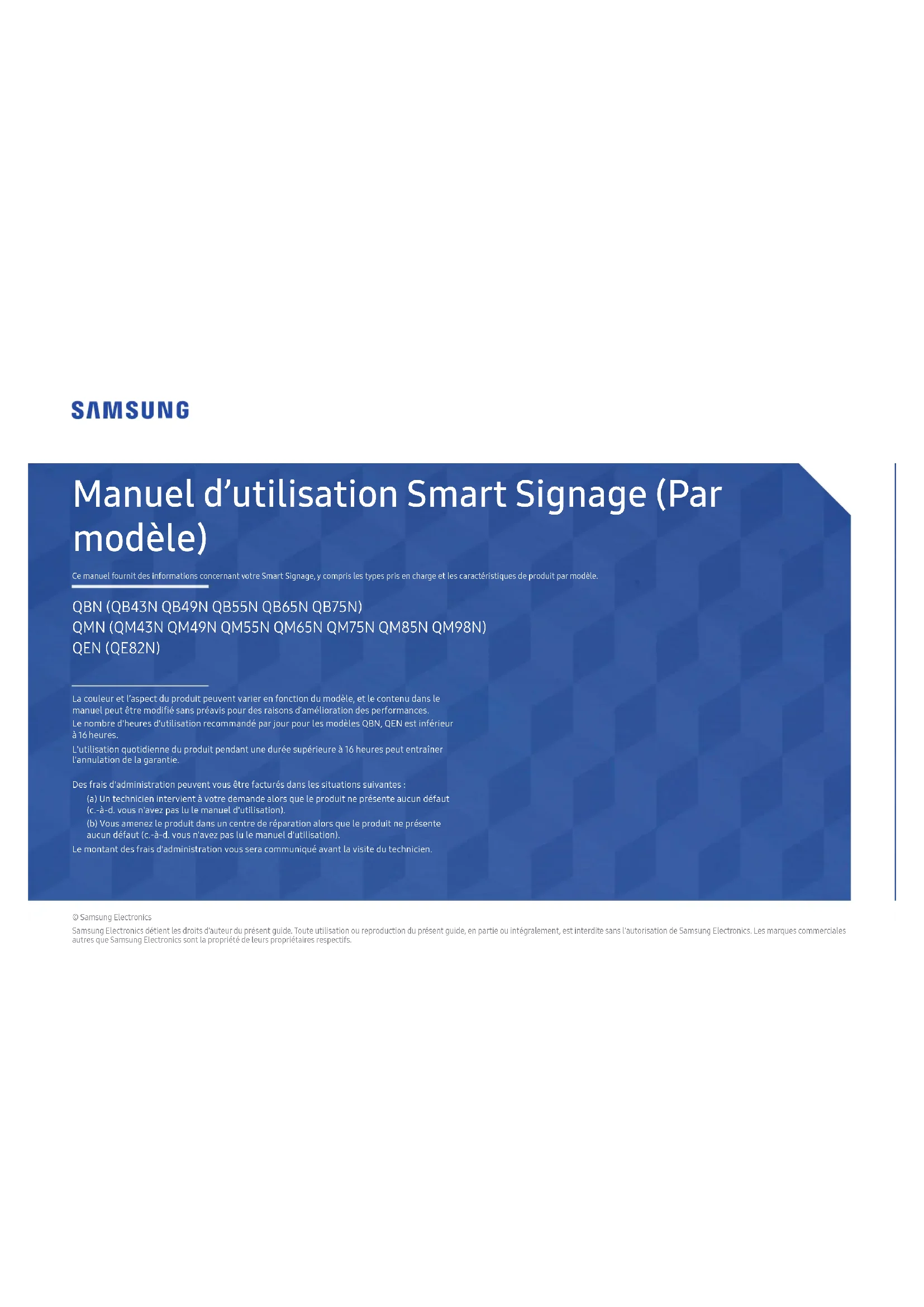 Manuel d’utilisation Smart Signage (Par modèle) Ce manuel fournit des informations concernant votre Smart Signage, y compris les types pris en charge et les caractéristiques de produit par modèle. © Samsung Electronics Samsung Electronics détient les droits d'auteur du présent guide. Toute utilisation ou reproduction du présent guide, en partie ou intégralement, est interdite sans l'autorisation de Samsung Electronics. Les marques commerciales autres que Samsung Electronics sont la propriété de leurs propriétaires respectifs. QBN (QB43N QB49N QB55N QB65N QB75N) QMN (QM43N QM49N QM55N QM65N QM75N QM85N QM98N) QEN (QE82N) La couleur et l’aspect du produit peuvent varier en fonction du modèle, et le contenu dans le manuel peut être modié sans préavis pour des raisons d’amélioration des performances. Le nombre d'heures d'utilisation recommandé par jour pour les modèles QBN, QEN est inférieur à 16 heures. L'utilisation quotidienne du produit pendant une durée supérieure à 16heures peut entraîner l'annulation de la garantie. Des frais d'administration peuvent vous être facturés dans les situations suivantes: (a) Un technicien intervient à votre demande alors que le produit ne présente aucun défaut (c.-à-d. vous n'avez pas lu le manuel d'utilisation). (b) Vous amenez le produit dans un centre de réparation alors que le produit ne présente aucun défaut (c.-à-d. vous n'avez pas lu le manuel d'utilisation). Le montant des frais d'administration vous sera communiqué avant la visite du technicien.Table des matières Préparatifs Vérification des composants 3 Pièces 4 Q*43N/Q*49N/Q*55N/Q*65N/Q*75N 4 QM85N 5 QM98N 6 QE82N 7 Verrou antivol 8 Ports 9 Q*43N/Q*49N/Q*55N/Q*65N/Q*75N 9 QM85N/QM98N 10 QE82N 11 Menu de commande 12 Q*43N/Q*49N/Q*55N/Q*65N/Q*75N/QE82N/ QM98N 12 QM85N 13 Avant d'installer le produit (Guide d'installation) 14 Angle d'inclinaison et rotation 14 Ventilation 14 Installation du support mural 15 Préparation préalable à l'installation du support mural 15 Installation du support mural 15 Spécifications du kit de montage mural (VESA) 16 Caractéristiques techniques Général 17 Présélection des modes de temporisation 19 Annexe Licence 21