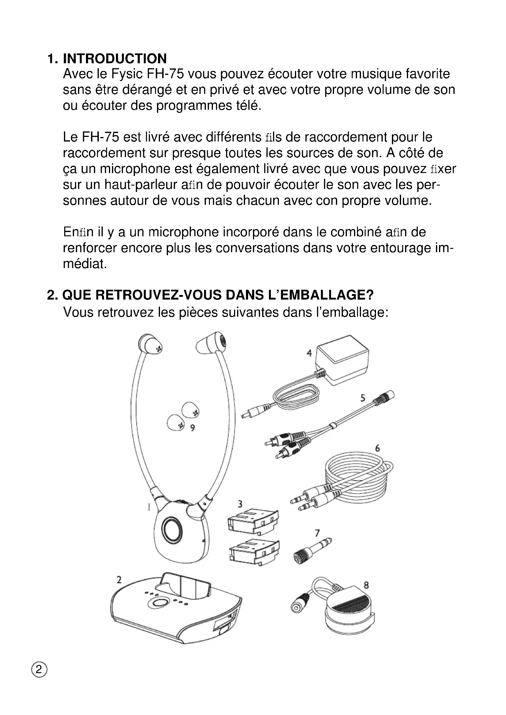 Avec le Fysic FH-75 vous pouvez écouter votre musique favorite sans être dérangé et en privé et avec votre propre volume de son ou écouter des programmes télé. Le FH-75 est livré avec différents fi ls de raccordement pour le raccordement sur presque toutes les sources de son. A côté de ça un microphone est également livré avec que vous pouvez fi xer sur un haut-parleur afi n de pouvoir écouter le son avec les per- sonnes autour de vous mais chacun avec con propre volume. Enfi n il y a un microphone incorporé dans le combiné afi n de renforcer encore plus les conversations dans votre entourage im- médiat.