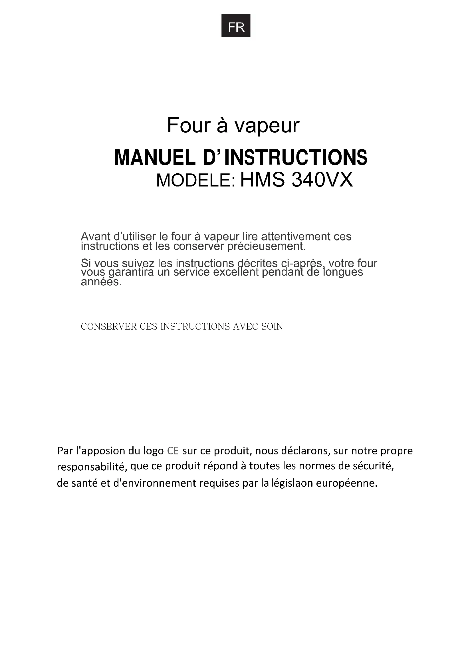 Modèles Tension standard de l’appareilPuissance nominale en entrée (Grill)Puissance d’entrée nominale (Convection) Capacité volumétrique du fourDimensions externes(LxPxH)Poids netPuissance nominale d’entrée (vapeur)Puissance nominale d’entrée (maximum) FR-2 HMS 340VXAfin de diminuer le risque d’incendie, court-circuit, dommages aux personnes ou exposition excessive à l’énergie durant l’utilisation de l’appareil, nous vous conseillons de suivre les précautions de base suivantes: 1.Attention: Liquides ou autres aliments ne doivent pas être réchauffés dans des flacons fermés hermétiquement car ils sont susceptibles d’exploser. 2.Attention: il est dangereux pour tout personnel non spécialisé de démonter la couverture de protection prévue pour garantir la protection contre l’exposition à l’énergie .