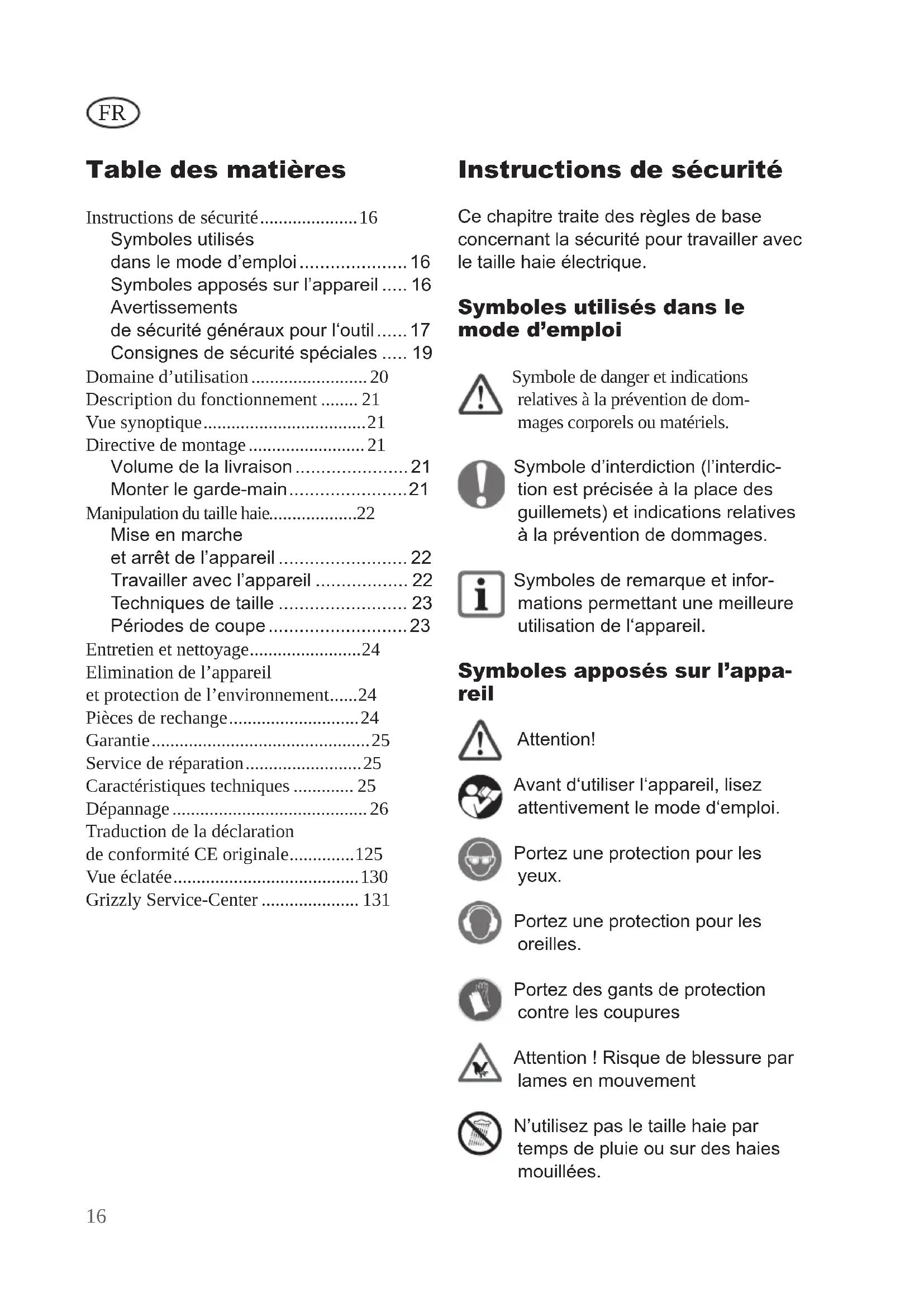 - Instructions de sécurité Ce chapitre traite des règles de base concernant la sécurité pour travailler avec le taille haie électrique. Symboles utilisés dans le mode d’emploi Symbole de danger et indications relatives à la prévention de dom- mages corporels ou matériels. Symbole d’interdiction (l’interdic- tion est précisée à la place des guillemets) et indications relatives à la prévention de dommages. Symboles de remarque et infor- mations permettant une meilleure utilisation de l‘appareil. Symboles apposés sur l’appa- reil Attention! Avant d‘utiliser l‘appareil, lisez attentivement le mode d‘emploi. Portez une protection pour les yeux. Portez une protection pour les oreilles. Portez des gants de protection contre les coupures Attention ! Risque de blessure par lames en mouvement N’utilisez pas le taille haie par temps de pluie ou sur des haies mouillées. Table des matières Instructions de sécurité p. 16