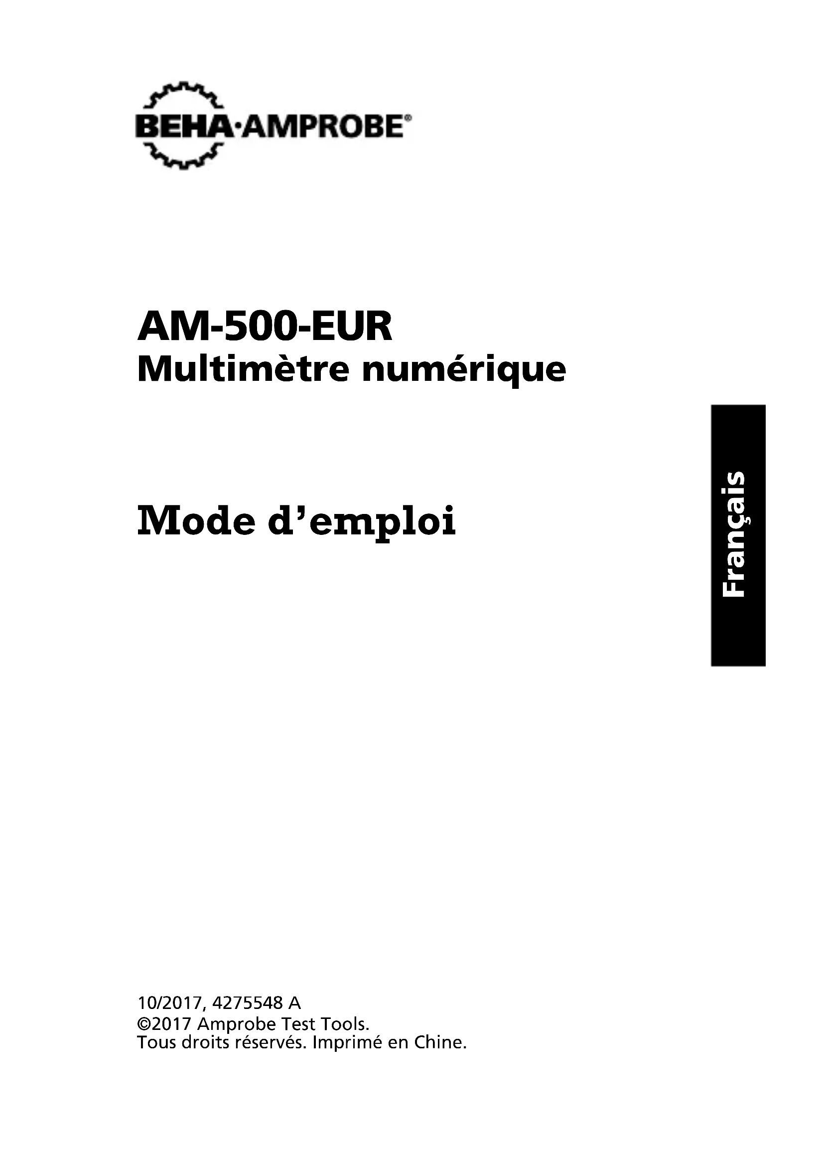 F2Français AM-500-EUR Multimètre numérique Mode d’emploi 10/2017, 4275548 A ©2017 Amprobe Test Tools. Tous droits réservés. Imprimé en Chine.Limites de garantie et de responsabilité Amprobe garantit l’absence de vices de matériaux et de fabrication de ce produit pendant une période d’un an prenant effet à la date d’achat, sauf disposition contraire prévue par la loi. Cette garantie ne s’applique pas aux fusibles, aux piles jetables ni à tout produit mal utilisé, modifié, contaminé, négligé ou endommagé par accident ou soumis à des conditions anormales d’utilisation et de manipulation. Les revendeurs n’ont pas l’autorisation de prolonger toute autre garantie au nom d’Amprobe. Pour bénéficier de la garantie, renvoyez le produit accompagné d’un justificatif d’achat auprès d’un centre de services agréé par Amprobe ou d’un distributeur ou d’un revendeur Amprobe. Voir la section Réparation pour tous les détails. LA PRÉSENTE GARANTIE EST LE SEUL ET EXCLUSIF RECOURS DE L’UTILISATEUR TOUTES AUTRES GARANTIES, EXPLICITES, IMPLICITES OU STATUTAIRES, NOTAMMENT LE CAS ÉCHÉANT LES GARANTIES DE QUALITÉ MARCHANDE OU D’ADAPTATION À UN OBJECTIF PARTICULIER SONT EXCLUES PAR LES PRÉSENTES. LE FABRICANT NE SERA EN AUCUN CAS TENU RESPONSABLE DE DOMMAGES PARTICULIERS, INDIRECTS, ACCIDENTELS OU CONSÉCUTIFS, NI D’AUCUNS DÉGATS OU PERTES DE DONNÉES, SUR UNE BASE CONTRACTUELLE, EXTRA- CONTRACTUELLE OU AUTRE. Étant donné que certaines juridictions n’admettent pas les limitations d’une condition de garantie implicite ou l’exclusion ou la limitation de dégâts accidentels ou consécutifs, il se peut que les limitations et les exclusions de cette garantie ne s’appliquent pas à votre cas. Réparation Tous les outils de test renvoyés pour être réparés au titre de la garantie ou pour étalonnage doivent être accompagnés des éléments suivants : nom, raison sociale, adresse, numéro de téléphone et justificatif d’achat. Ajoutez également une brève description du problème ou du service demandé et incluez les cordons de test avec l’appareil. Les frais de remplacement ou de réparation hors garantie doivent être acquittés par chèque, mandat, carte de crédit avec date d’expiration, ou par bon de commande payable à l’ordre de Amprobe®. Remplacements et réparations sous garantie – Tous pays Veuillez lire la déclaration de garantie et vérifiez la pile avant de demander une réparation. Pendant la période de garantie, tout outil de test défectueux peut être renvoyé auprès de votre distributeur Amprobe® pour être échangé contre un produitidentique ou similaire. Consultez la section « Where to Buy » sur le site www.amprobe.com pour obtenir la liste des distributeurs dans votre région. Les appareils sous garantie devant être remplacés ou réparés au Canada et aux États-Unis peuvent également être envoyés dans un centre de services Amprobe® (voir les adresses ci-dessous). Remplacements et réparations hors garantie – Canada et États-Unis Les appareils à réparer hors garantie au Canada et aux États- Unis doivent être envoyés dans un centre de services Amprobe®. Appelez Amprobe® ou renseignez-vous auprès de votre lieu d’achat pour connaître les tarifs en vigueur de remplacement ou de réparation. Aux États-Unis et au Canada Amprobe Amprobe Everett, WA 98203 Mississauga, ON L4Z 1X9Canada Tél. : 877-AMPROBE (267-7623) Tél. : 905-890-7600 Remplacements et réparations hors garantie – Europe Les appareils européens non couverts par la garantie peuvent être remplacés par votre distributeur Amprobe® pour une somme nominale. Consultez la section « Where to Buy » sur le site www. metermantesttools.com pour obtenir la liste des distributeurs dans votre région. Adresse postale européenne* Amprobe® Test Tools Europe Beha-Amprobe GmbH In den Engematten 14 79286 Glottertal, Allemagne Tél. : +49 (0) 7684 8009 - 0 www.beha-amprobe.com *(Réservée à la correspondance – Aucun remplacement ou réparation n’est possible à cette adresse. Nos clients européens doivent contacter leur distributeur.)Multimètre numérique AM-500-EUR