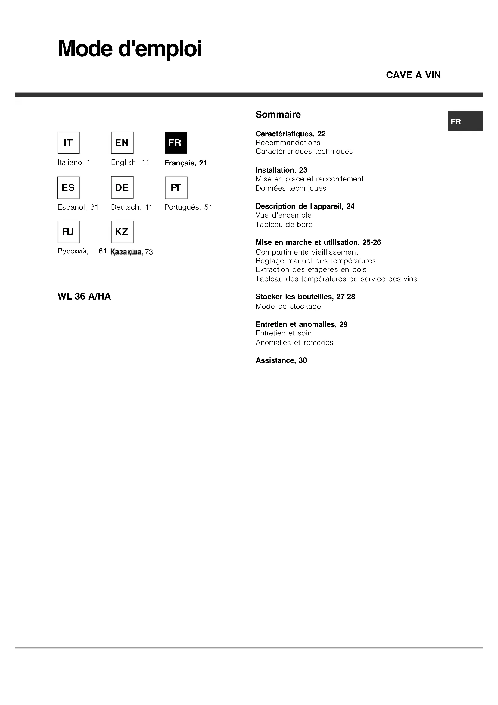 08/2012FR FORNO WL 36 A/HA Sommaire Caractéristiques, 22 Recommandations Caractérisriques techniques Installation, 23 Mise en place et raccordement Données techniques Description de l'appareil, 24 Vue d'ensemble Tableau de bord Mise en marche et utilisation, 25-26 Compartiments vieillissement Réglage manuel des températures Extraction des étagères en bois Tableau des températures de service des vins Stocker les bouteilles, 27-28 Mode de stockage Entretien et anomalies, 29 Entretien et soin Anomalies et remèdes Assistance, 30 Italiano, 1 Français, 21 Espanol, 31 Deutsch, 41 English, 11