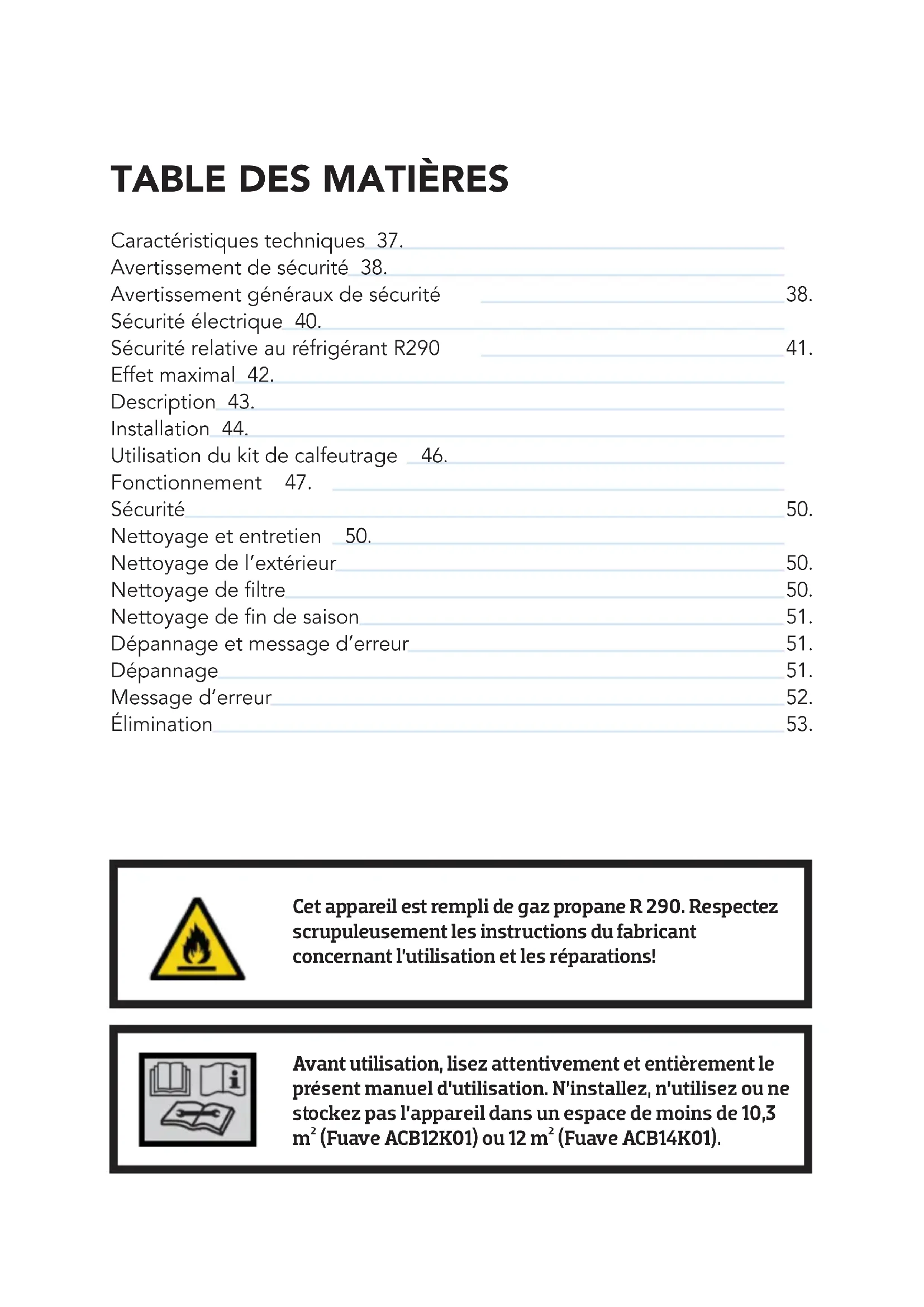 - N’installez, n’utilisez ou ne stockez pas l’appareil dans un espace de moins de 10,3 m² (Fuave ACB12K01) ou 12 m² (Fuave ACB12K01).