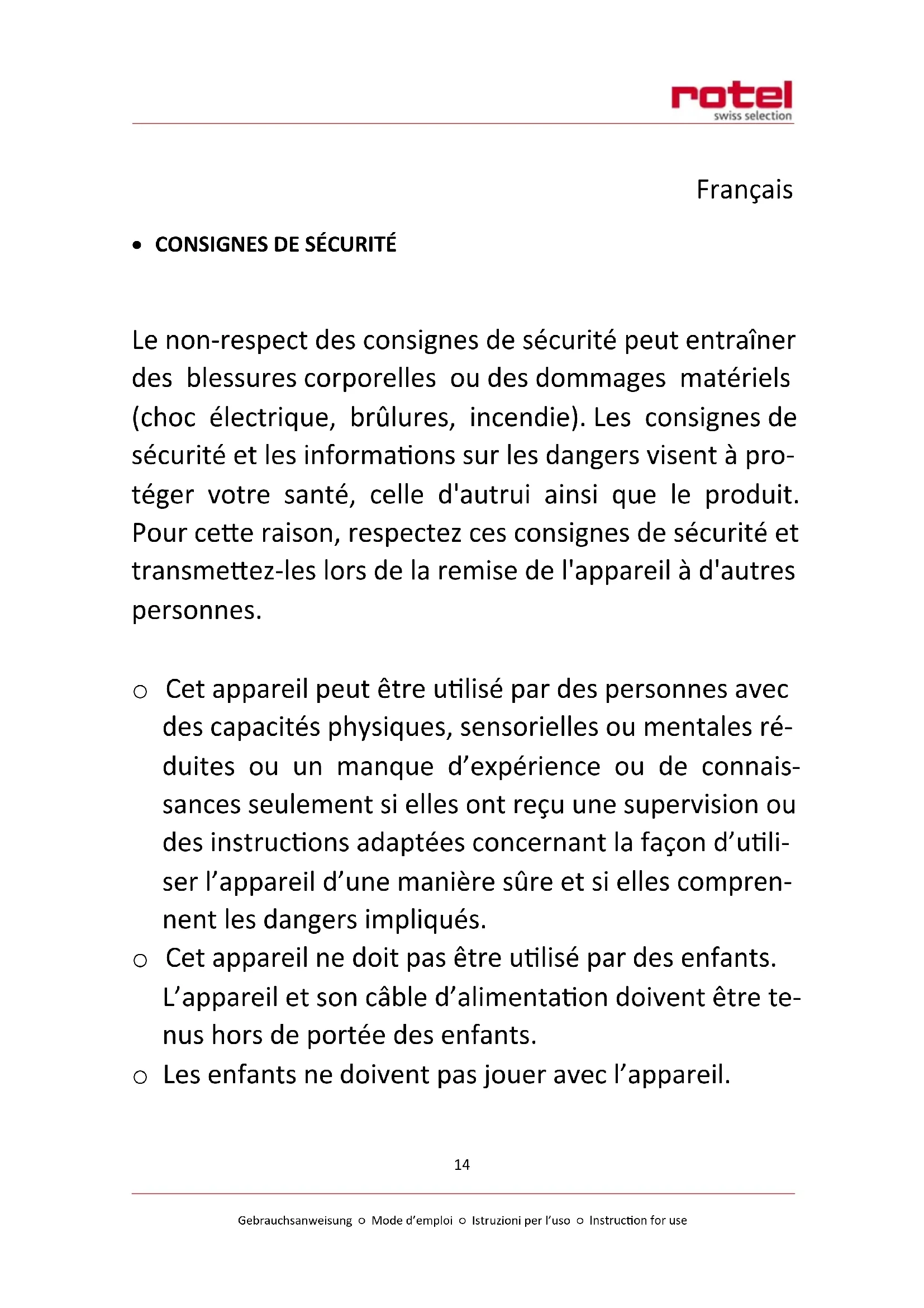 - CONSIGNES DE SÉCURITÉ Le non-respect des consignes de sécurité peut entraîner des blessures corporelles ou des dommages matériels (choc électrique, brûlures, incendie). Les consignes de sécurité et les informations sur les dangers visent à pro- téger votre santé, celle d'autrui ainsi que le produit. Pour cette raison, respectez ces consignes de sécurité et transmettez-les lors de la remise de l'appareil à d'autres personnes. o Cet appareil peut être utilisé par des personnes avec des capacités physiques, sensorielles ou mentales ré- duites ou un manque d’expérience ou de connais- sances seulement si elles ont reçu une supervision ou des instructions adaptées concernant la façon d’utili- ser l’appareil d’une manière sûre et si elles compren- nent les dangers impliqués. o Cet appareil ne doit pas être utilisé par des enfants. L’appareil et son câble d’alimentation doivent être te- nus hors de portée des enfants. o Les enfants ne doivent pas jouer avec l’appareil.Gebrauchsanweisung ○ Mode d’emploi ○ Istruzioni per l’uso ○ Instruction for use