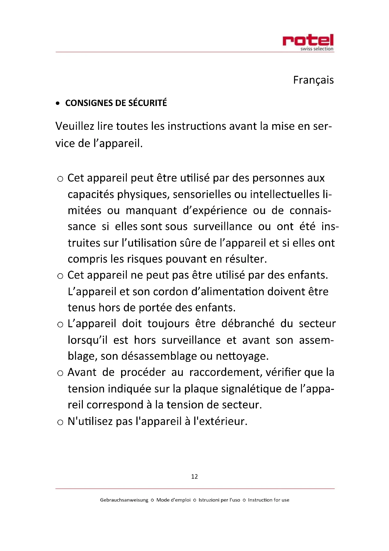 - ÉLIMINATION o Pour une élimination dans les règles de l’art, veuillez remettre l’appareil à un reven- deur, un responsable du service après-vente ou Rotel SA. o Selon la directive européenne 2012/19/UE relative aux déchets d’équipements élec- triques et électroniques (DEEE), les appareils électroménagers ne doivent pas être éliminés avec les déchets solides urbains normaux. Les appareils hors d’usage doivent être collectés séparément pour optimiser le coût de réutilisation et de recyclage des matériaux contenus dans la machine tout en évitant les risques potentiels pour la santé publique et l’environnement. Le symbole de poubelle barrée figure sur tous les produits pour rappeler à leur propriétaire les obligations de tri sélectif des déchets. Pour de plus amples informations sur la mise au rebut correcte des appareils électro- ménagers, les consommateurs sont invités à contacter les autorités locales ou ven- deurs d’électroménagers. Cet appareil est conforme aux directives européennes suivantes : 2014/35/UE (Équipement basse tension) 2014/30/UE (Compatibilité électromagnétique)Gebrauchsanweisung ○ Mode d’emploi ○ Istruzioni per l’uso ○ Instruction for use