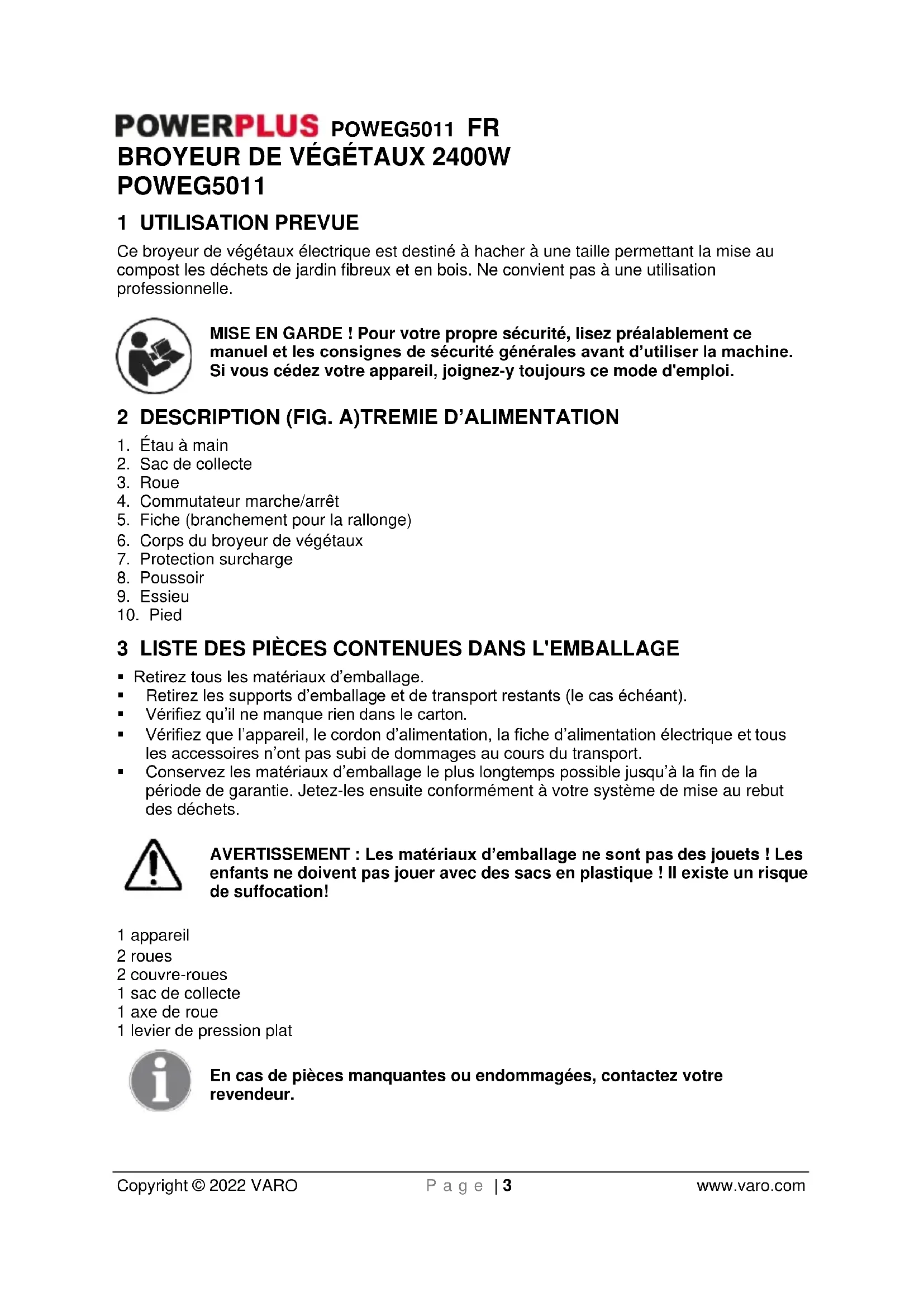 enfants ne doivent pas jouer avec des sacs en plastique ! Il existe un risque de suffocation! 1 appareil 2 roues 2 couvre-roues 1 sac de collecte 1 axe de roue 1 levier de pression plat En cas de pièces manquantes ou endommagées, contactez votre revendeur.POWEG5011 FR Copyright © 2022 VARO P a g e | 4 www.varo.com 4 PICTOGRAMMES