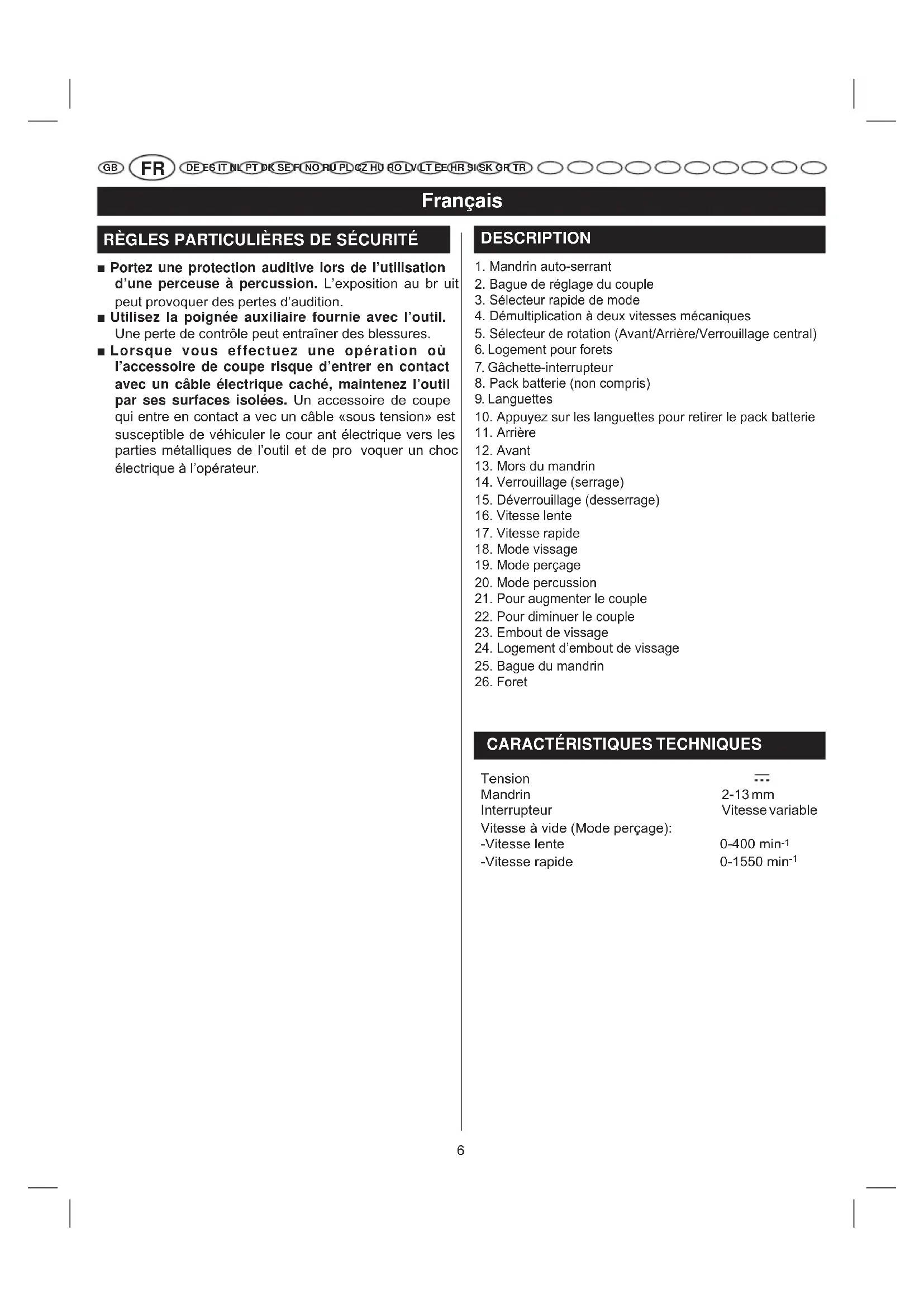 DE ES IT NL PT DK SE FI NO RU PL CZ HU RO LV LT EE HR SI SK GR TR RÈGLES PARTICULIÈRES DE SÉCURITÉ ■ Portez une protection auditive lors de l’utilisation d’une perceuse à percussion. L’exposition au br uit peut provoquer des pertes d’audition. ■ Utilisez la poignée auxiliaire fournie avec l’outil. Une perte de contrôle peut entraîner des blessures. ■ Lorsque vous effectuez une opération où l’accessoire de coupe risque d’entrer en contact avec un câble électrique caché, maintenez l’outil par ses surfaces isolées. Un accessoire de coupe qui entre en contact a vec un câble «sous tension» est susceptible de véhiculer le cour ant électrique vers les parties métalliques de l’outil et de pro voquer un choc électrique à l’opérateur.