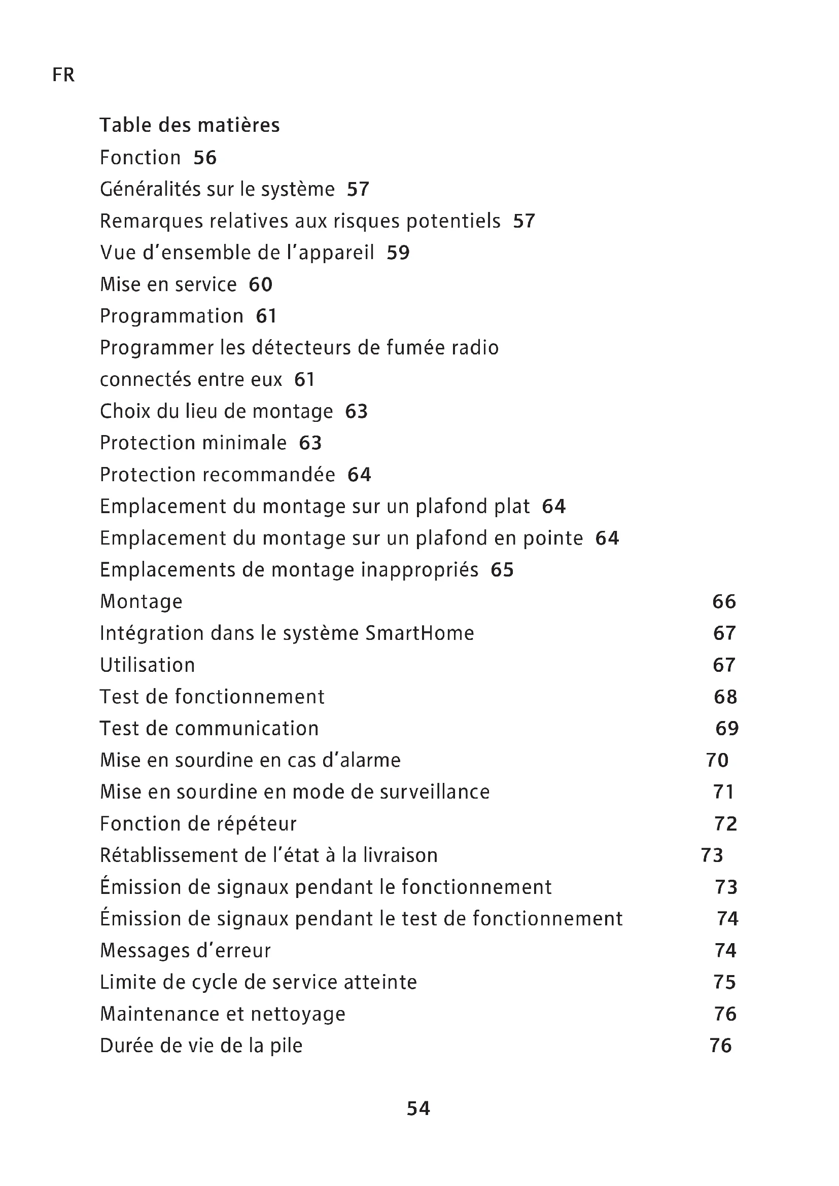 Table des matières Fonction 56 Généralités sur le système 57 Remarques relatives aux risques potentiels 57 Vue d’ensemble de l’appareil 59 Mise en service 60 Programmation 61 Programmer les détecteurs de fumée radio connectés entre eux 61 Choix du lieu de montage 63 Protection minimale 63 Protection recommandée 64 Emplacement du montage sur un plafond plat 64 Emplacement du montage sur un plafond en pointe 64 Emplacements de montage inappropriés 65 Montage 66 Intégration dans le système SmartHome 67 Utilisation 67 Test de fonctionnement 68 Test de communication 69 Mise en sourdine en cas d’alarme 70 Mise en sourdine en mode de surveillance 71 Fonction de répéteur 72 Rétablissement de l’état à la livraison 73 Émission de signaux pendant le fonctionnement 73 Émission de signaux pendant le test de fonctionnement 74 Messages d’erreur 74 Limite de cycle de service atteinte 75 Maintenance et nettoyage 76 Durée de vie de la pile 76FR