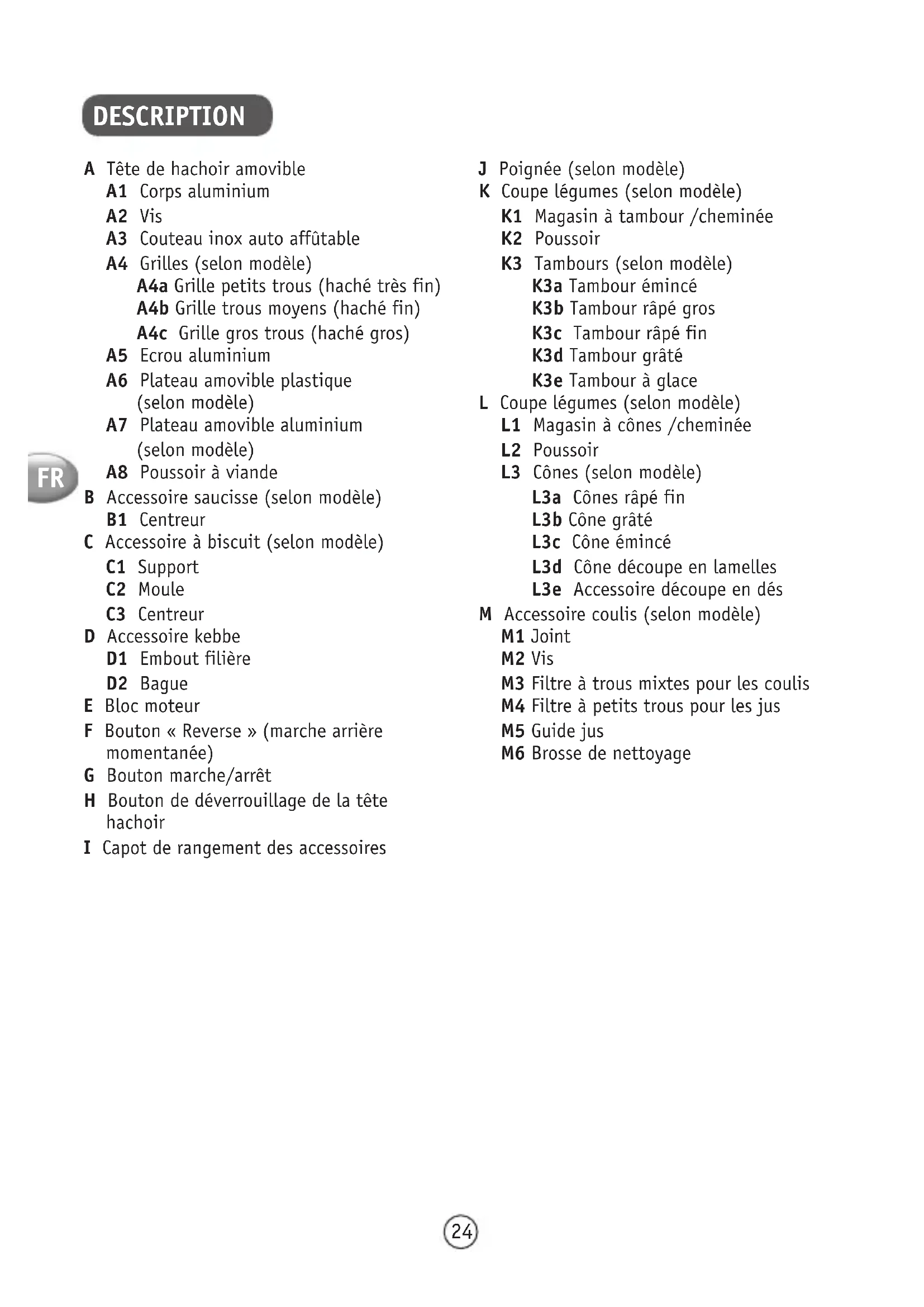 DESCRIPTION A Tête de hachoir amovible A1 Corps aluminium A2 Vis A3 Couteau inox auto affûtable A4 Grilles (selon modèle) A4a Grille petits trous (haché très fin) A4b Grille trous moyens (haché fin) A4c Grille gros trous (haché gros) A5 Ecrou aluminium A6 Plateau amovible plastique (selon modèle) A7 Plateau amovible aluminium (selon modèle) A8 Poussoir à viande B Accessoire saucisse (selon modèle) B1 Centreur C Accessoire à biscuit (selon modèle) C1 Support C2 Moule C3 Centreur D Accessoire kebbe D1 Embout filière D2 Bague E Bloc moteur F Bouton « Reverse » (marche arrière momentanée) G Bouton marche/arrêt H Bouton de déverrouillage de la tête hachoir I Capot de rangement des accessoires J Poignée (selon modèle) K Coupe légumes (selon modèle) K1 Magasin à tambour /cheminée K2 Poussoir K3 Tambours (selon modèle) K3a Tambour émincé K3b Tambour râpé gros K3c Tambour râpé fin K3d Tambour grâté K3e Tambour à glace L Coupe légumes (selon modèle) L1 Magasin à cônes /cheminée L2 Poussoir L3 Cônes (selon modèle) L3a Cônes râpé fin L3b Cône grâté L3c Cône émincé L3d Cône découpe en lamelles L3e Accessoire découpe en dés M Accessoire coulis (selon modèle) M1 Joint M2 Vis M3 Filtre à trous mixtes pour les coulis M4 Filtre à petits trous pour les jus M5 Guide jus M6 Brosse de nettoyage25