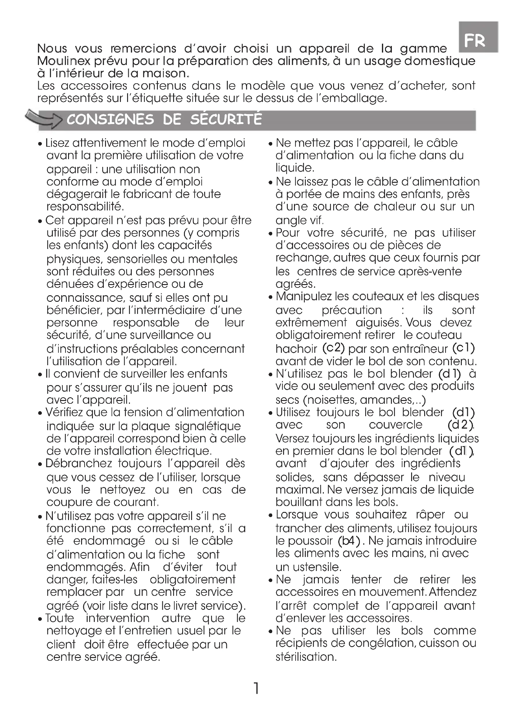 - Ne pas utiliser les bols comme récipients de congélation, cuisson ou stérilisation. NNoouuss vvoouuss rreemmeerrcciioonnss dd’’aavvooiirr cchhooiissii uunn aappppaarreeiill ddee llaa ggaammmmee MMoouulliinneexx pprréévvuu ppoouurr llaa pprrééppaarraattiioonn ddeess aalliimmeennttss,, àà uunn uussaaggee ddoommeessttiiqquuee àà ll’’iinnttéérriieeuurr ddee llaa mmaaiissoonn.. Les accessoires contenus dans le modèle que vous venez d’acheter, sont représentés sur l’étiquette située sur le dessus de l’emballage. FR2
