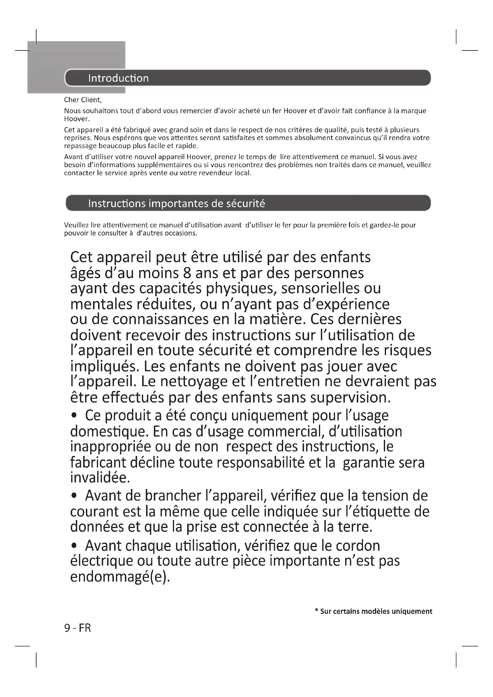 - Sur certains modèles uniquement Introducon Cher Client, Nous souhaitons tout d’abord vous remercier d’avoir acheté un fer Hoover et d’avoir fait conance à la marque Hoover. Cet appareil a été fabriqué avec grand soin et dans le respect de nos critères de qualité, puis testé à plusieurs reprises. Nous espérons que vos aentes seront sasfaites et sommes absolument convaincus qu’il rendra votre repassage beaucoup plus facile et rapide. Avant d’uliser votre nouvel appareil Hoover, prenez le temps de lire aenvement ce manuel. Si vous avez besoin d’informaons supplémentaires ou si vous rencontrez des problèmes non traités dans ce manuel, veuillez contacter le service après vente ou votre revendeur local. Instrucons importantes de sécurité Veuillez lire aenvement ce manuel d’ulisaon avant d’uliser le fer pour la première fois et gardez-le pour pouvoir le consulter à d’autres occasions. Cet appareil peut être ulisé par des enfants âgés d’au moins 8 ans et par des personnes ayant des capacités physiques, sensorielles ou mentales réduites, ou n’ayant pas d’expérience ou de connaissances en la maère. Ces dernières doivent recevoir des instrucons sur l’ulisaon de l’appareil en toute sécurité et comprendre les risques impliqués. Les enfants ne doivent pas jouer avec l’appareil. Le neoyage et l’entreen ne devraient pas être eectués par des enfants sans supervision.