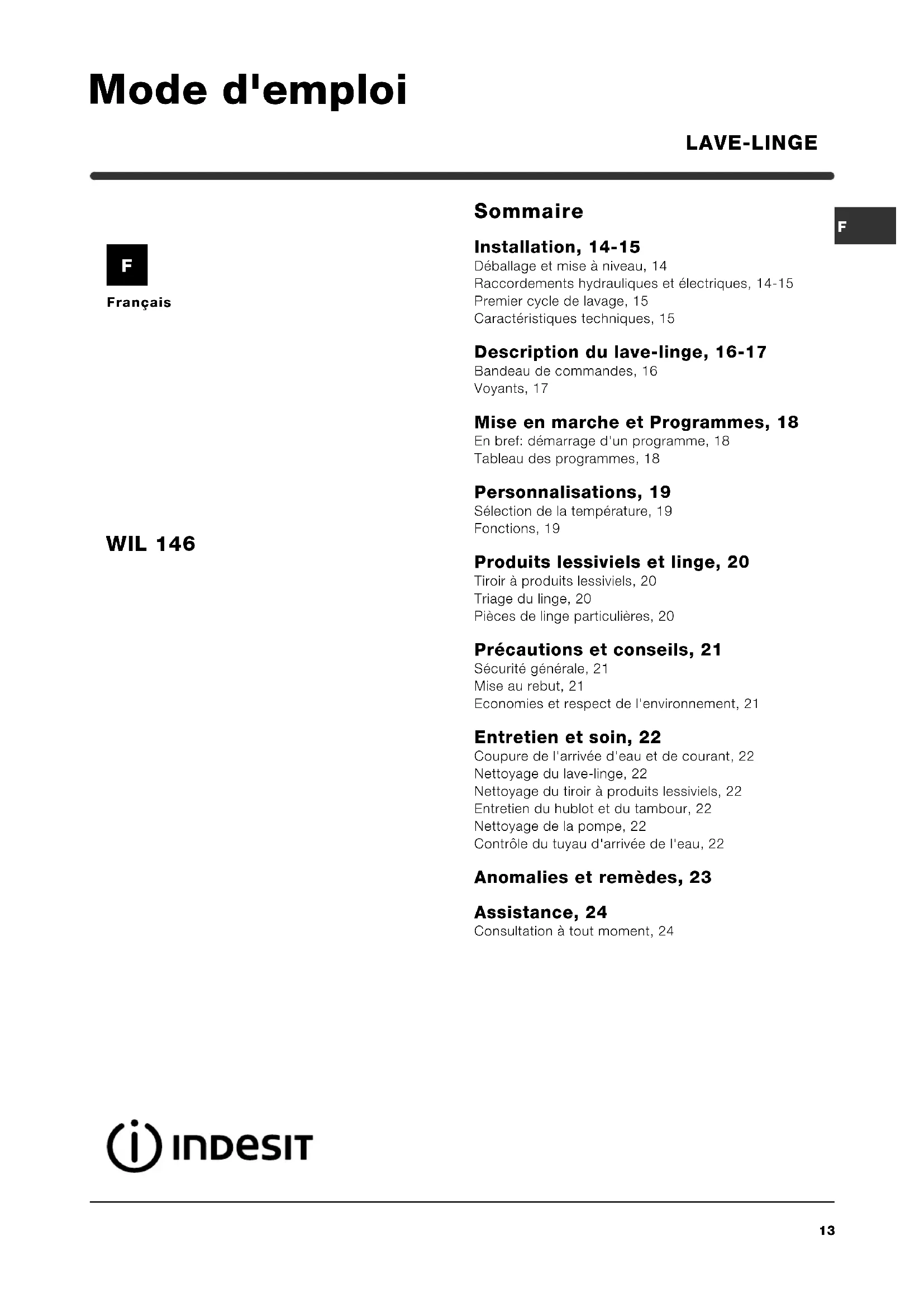 Français Sommaire Installation, 14-15 Déballage et mise à niveau, 14 Raccordements hydrauliques et électriques, 14-15 Premier cycle de lavage, 15 Caractéristiques techniques, 15 Description du lave-linge, 16-17 Bandeau de commandes, 16 Voyants, 17 Mise en marche et Programmes, 18 En bref: démarrage d'un programme, 18 Tableau des programmes, 18 Personnalisations, 19 Sélection de la température, 19 Fonctions, 19 Produits lessiviels et linge, 20 Tiroir à produits lessiviels, 20 Triage du linge, 20 Pièces de linge particulières, 20 Précautions et conseils, 21 Sécurité générale, 21 Mise au rebut, 21 Economies et respect de l'environnement, 21 Entretien et soin, 22 Coupure de l'arrivée d'eau et de courant, 22 Nettoyage du lave-linge, 22 Nettoyage du tiroir à produits lessiviels, 22 Entretien du hublot et du tambour, 22 Nettoyage de la pompe, 22 Contrôle du tuyau d'arrivée de l'eau, 22 Anomalies et remèdes, 23 Assistance, 24 Consultation à tout moment, 24 LAVE-LINGE WIL 146 Mode d'emploi F14