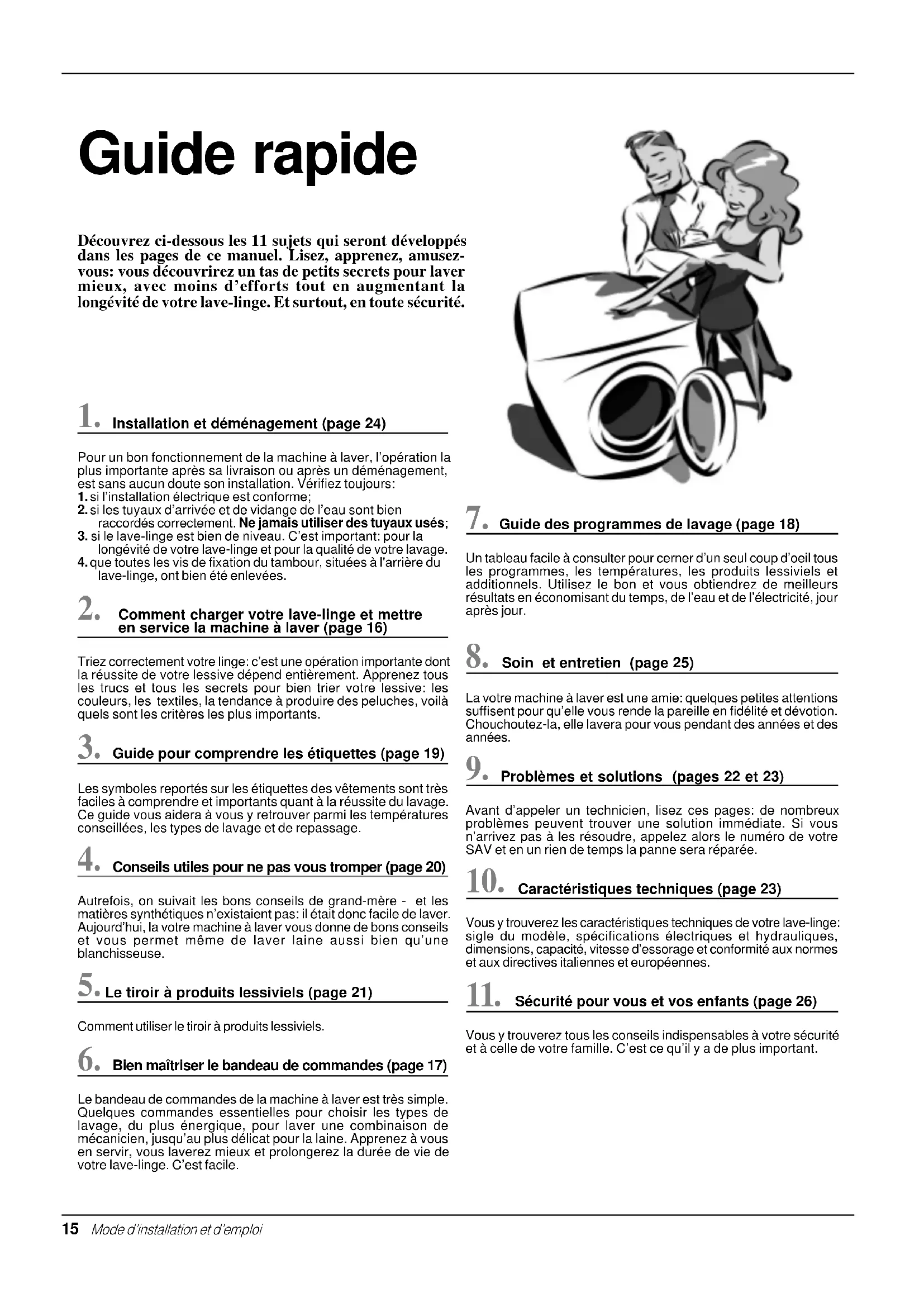 GARANDEERTIstructies voor het installeren en gebruik 14Mode dinstallation et demploi Découvrez ci-dessous les 11 sujets qui seront développés dans les pages de ce manuel. Lisez, apprenez, amusez- vous: vous découvrirez un tas de petits secrets pour laver mieux, avec moins d’efforts tout en augmentant la longévité de votre lave-linge. Et surtout, en toute sécurité. Guide rapide