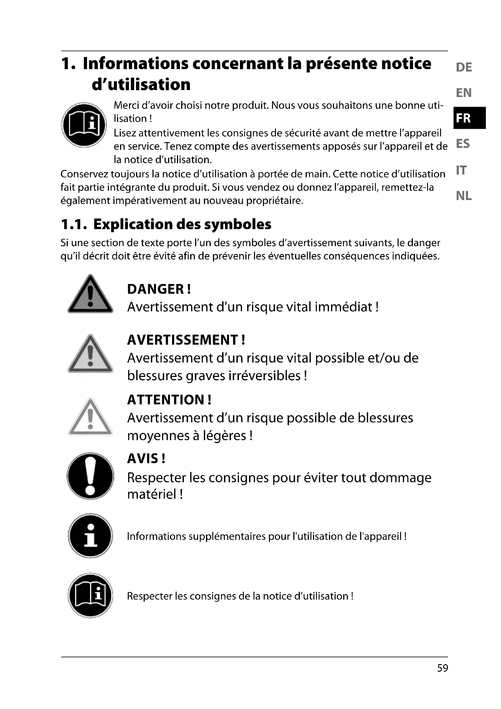 1. Informations concernant la présente notice d’utilisation ...................... 59