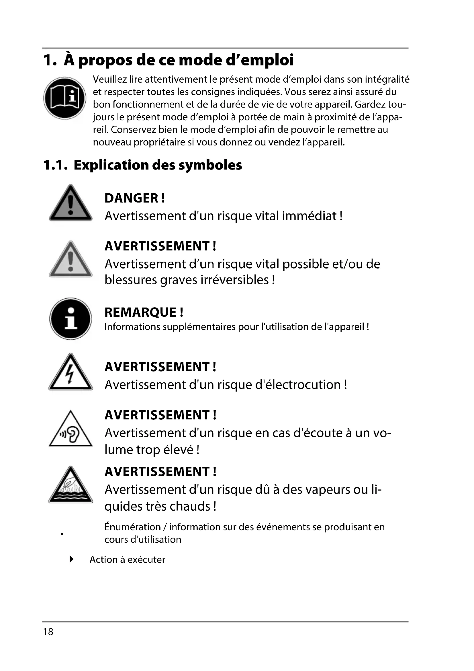 Veuillez lire attentivement le présent mode d’emploi dans son intégralité et respecter toutes les consignes indiquées. Vous serez ainsi assuré du bon fonctionnement et de la durée de vie de votre appareil. Gardez tou- jours le présent mode d’emploi à portée de main à proximité de l’appa- reil. Conservez bien le mode d’emploi afin de pouvoir le remettre au nouveau propriétaire si vous donnez ou vendez l’appareil. 1.1. Explication des symboles DANGER ! Avertissement d'un risque vital immédiat ! AVERTISSEMENT ! Avertissement d’un risque vital possible et/ou de blessures graves irréversibles! REMARQUE! Informations supplémentaires pour l'utilisation de l'appareil ! AVERTISSEMENT ! Avertissement d'un risque d'électrocution ! AVERTISSEMENT! Avertissement d'un risque en cas d'écoute à un vo- lume trop élevé ! AVERTISSEMENT! Avertissement d'un risque dû à des vapeurs ou li- quides très chauds !