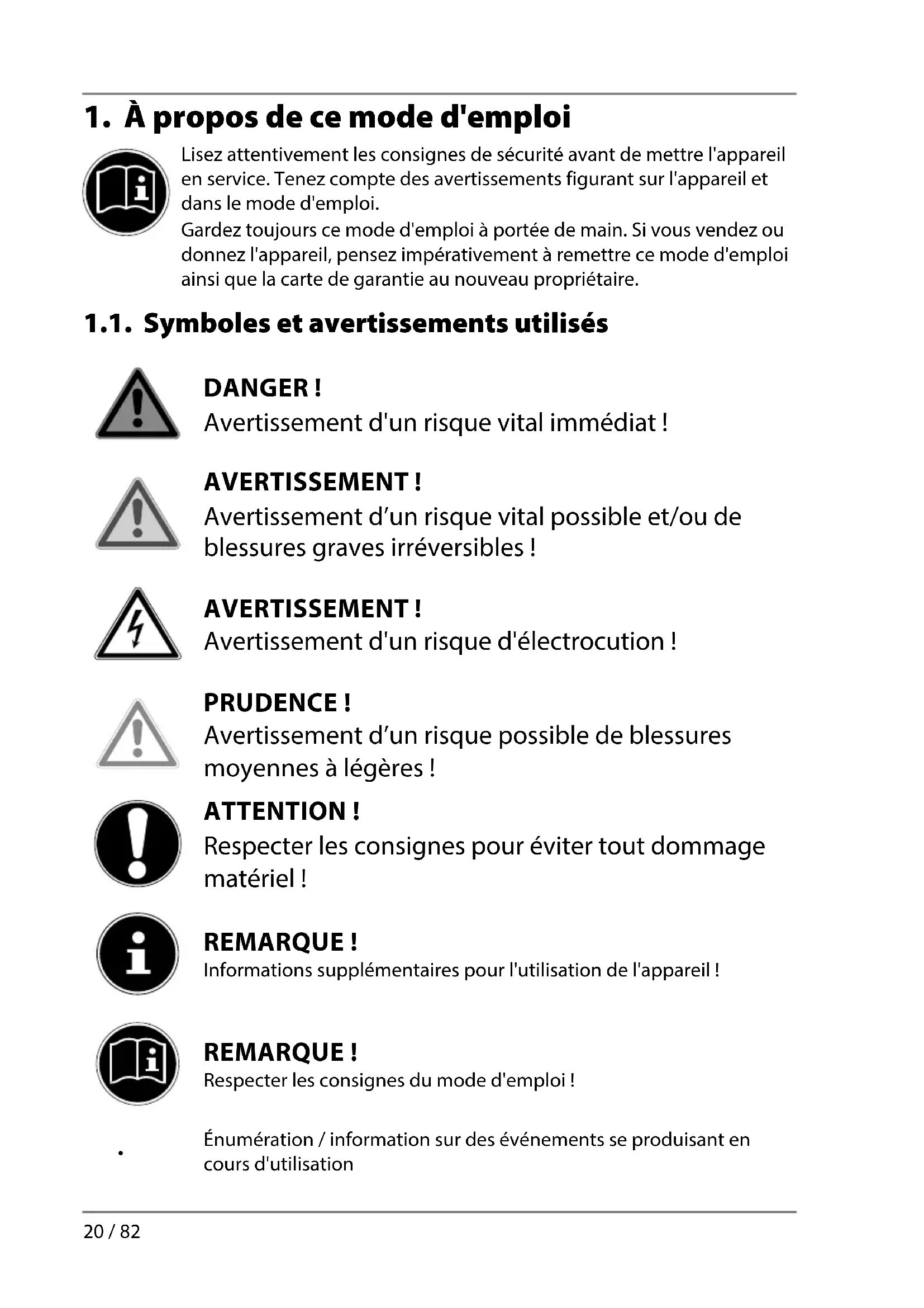 Lisez attentivement les consignes de sécurité avant de mettre l'appareil en service. Tenez compte des avertissements figurant sur l'appareil et dans le mode d'emploi. Gardez toujours ce mode d'emploi à portée de main. Si vous vendez ou donnez l'appareil, pensez impérativement à remettre ce mode d'emploi ainsi que la carte de garantie au nouveau propriétaire. 1.1. Symboles et avertissements utilisés DANGER ! Avertissement d'un risque vital immédiat ! AVERTISSEMENT ! Avertissement d’un risque vital possible et/ou de blessures graves irréversibles! AVERTISSEMENT ! Avertissement d'un risque d'électrocution ! PRUDENCE! Avertissement d’un risque possible de blessures moyennes à légères ! ATTENTION! Respecter les consignes pour éviter tout dommage matériel ! REMARQUE! Informations supplémentaires pour l'utilisation de l'appareil ! REMARQUE! Respecter les consignes du mode d'emploi !