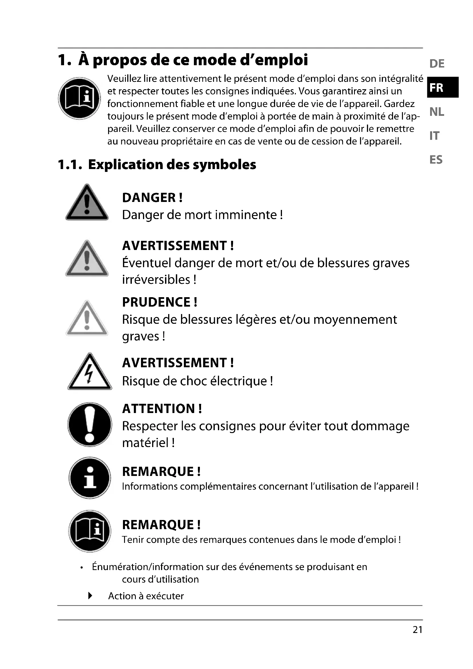 Veuillez lire attentivement le présent mode d’emploi dans son intégralité et respecter toutes les consignes indiquées. Vous garantirez ainsi un fonctionnement fiable et une longue durée de vie de l’appareil. Gardez toujours le présent mode d’emploi à portée de main à proximité de l’ap- pareil. Veuillez conserver ce mode d’emploi afin de pouvoir le remettre au nouveau propriétaire en cas de vente ou de cession de l’appareil. 1.1. Explication des symboles DANGER! Danger de mort imminente ! AVERTISSEMENT! Éventuel danger de mort et/ou de blessures graves irréversibles ! PRUDENCE! Risque de blessures légères et/ou moyennement graves ! AVERTISSEMENT! Risque de choc électrique ! ATTENTION! Respecter les consignes pour éviter tout dommage matériel ! REMARQUE! Informations complémentaires concernant l’utilisation de l’appareil ! REMARQUE! Tenir compte des remarques contenues dans le mode d’emploi !