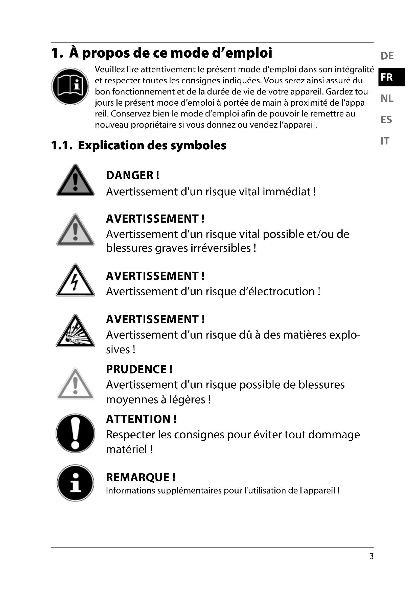 Veuillez lire attentivement le présent mode d’emploi dans son intégralité et respecter toutes les consignes indiquées. Vous serez ainsi assuré du bon fonctionnement et de la durée de vie de votre appareil. Gardez tou- jours le présent mode d’emploi à portée de main à proximité de l’appa- reil. Conservez bien le mode d’emploi afin de pouvoir le remettre au nouveau propriétaire si vous donnez ou vendez l’appareil. 1.1. Explication des symboles DANGER ! Avertissement d'un risque vital immédiat ! AVERTISSEMENT ! Avertissement d’un risque vital possible et/ou de blessures graves irréversibles! AVERTISSEMENT ! Avertissement d’un risque d’électrocution ! AVERTISSEMENT! Avertissement d’un risque dû à des matières explo- sives ! PRUDENCE! Avertissement d’un risque possible de blessures moyennes à légères ! ATTENTION! Respecter les consignes pour éviter tout dommage matériel ! REMARQUE! Informations supplémentaires pour l'utilisation de l'appareil ! 18004 MULI-WE MSN 5005 6215 Content final.indb 318004 MULI-WE MSN 5005 6215 Content final.indb 3 09.08.2017 13:30:1809.08.2017 13:30:184 REMARQUE! Respecter les consignes du mode d'emploi !