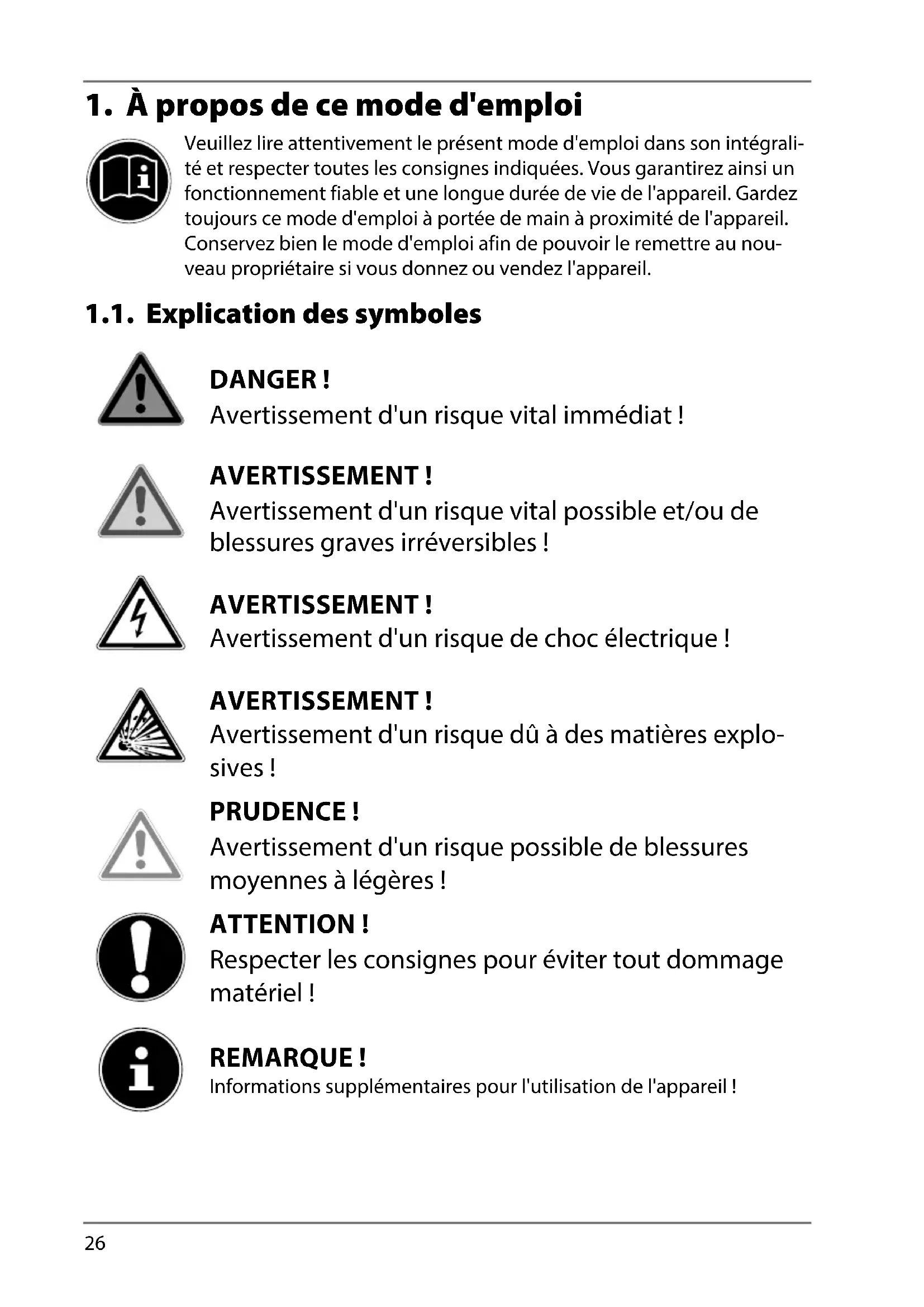 Veuillez lire attentivement le présent mode d'emploi dans son intégrali- té et respecter toutes les consignes indiquées. Vous garantirez ainsi un fonctionnement fiable et une longue durée de vie de l'appareil. Gardez toujours ce mode d'emploi à portée de main à proximité de l'appareil. Conservez bien le mode d'emploi afin de pouvoir le remettre au nou- veau propriétaire si vous donnez ou vendez l'appareil. 1.1. Explication des symboles DANGER ! Avertissement d'un risque vital immédiat ! AVERTISSEMENT ! Avertissement d'un risque vital possible et/ou de blessures graves irréversibles ! AVERTISSEMENT ! Avertissement d'un risque de choc électrique ! AVERTISSEMENT ! Avertissement d'un risque dû à des matières explo- sives ! PRUDENCE ! Avertissement d'un risque possible de blessures moyennes à légères! ATTENTION! Respecter les consignes pour éviter tout dommage matériel ! REMARQUE ! Informations supplémentaires pour l'utilisation de l'appareil !27