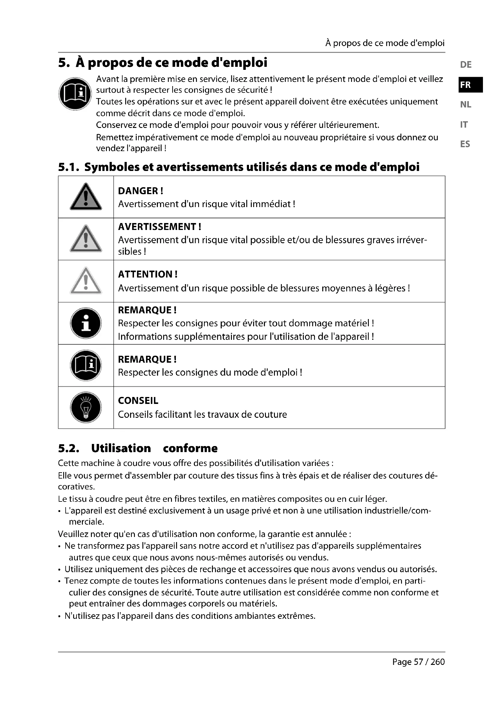 Avant la première mise en service, lisez attentivement le présent mode d'emploi et veillez surtout à respecter les consignes de sécurité ! Toutes les opérations sur et avec le présent appareil doivent être exécutées uniquement comme décrit dans ce mode d'emploi. Conservez ce mode d'emploi pour pouvoir vous y référer ultérieurement. Remettez impérativement ce mode d'emploi au nouveau propriétaire si vous donnez ou vendez l'appareil ! 5.1. Symboles et avertissements utilisés dans ce mode d'emploi DANGER! Avertissement d'un risque vital immédiat ! AVERTISSEMENT ! Avertissement d'un risque vital possible et/ou de blessures graves irréver- sibles ! ATTENTION ! Avertissement d'un risque possible de blessures moyennes à légères ! REMARQUE ! Respecter les consignes pour éviter tout dommage matériel ! Informations supplémentaires pour l'utilisation de l'appareil ! REMARQUE ! Respecter les consignes du mode d'emploi ! CONSEIL Conseils facilitant les travaux de couture 5.2. Utilisation conforme Cette machine à coudre vous offre des possibilités d'utilisation variées : Elle vous permet d'assembler par couture des tissus fins à très épais et de réaliser des coutures dé- coratives. Le tissu à coudre peut être en fibres textiles, en matières composites ou en cuir léger.