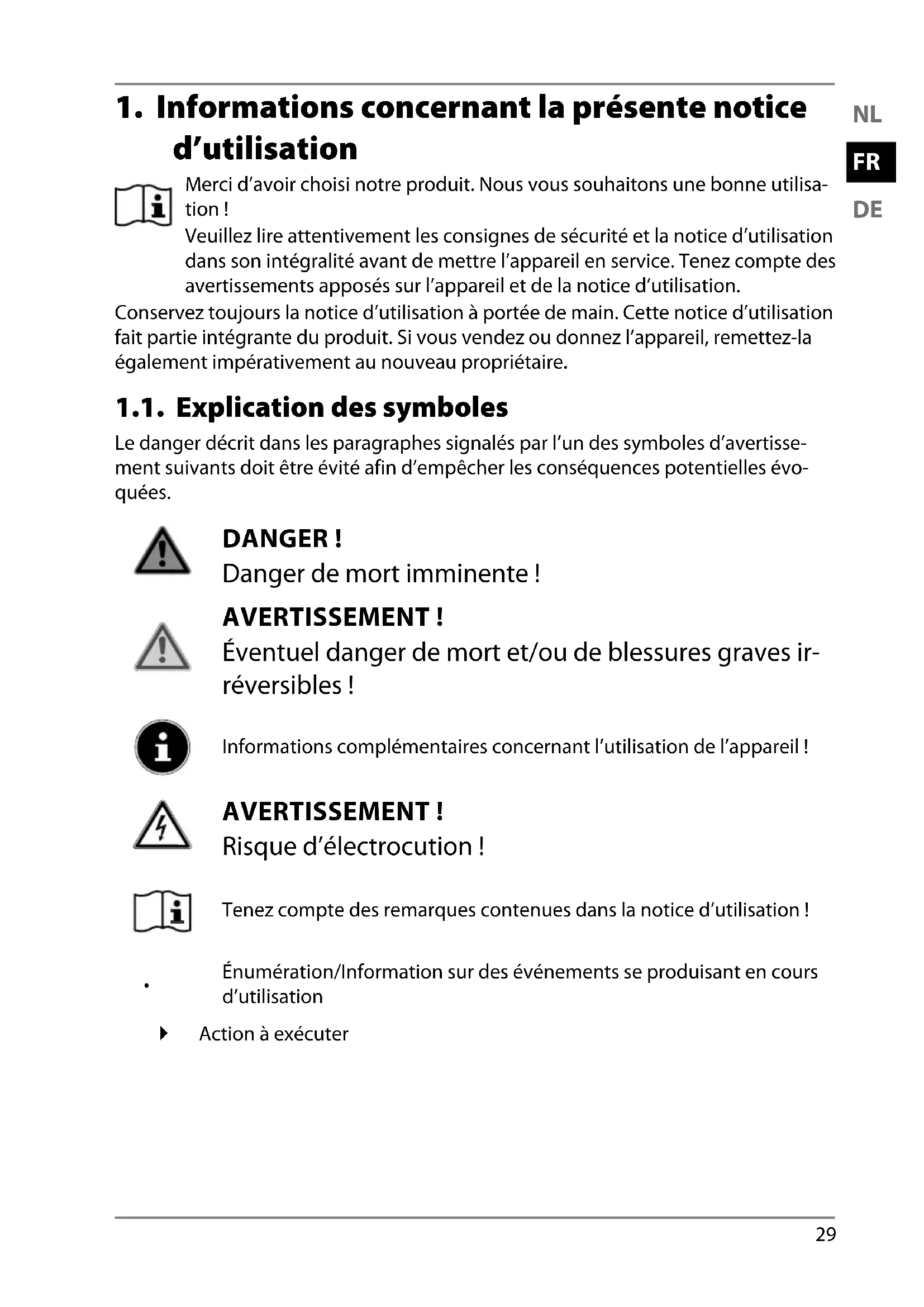1. Informations concernant la présente notice d’utilisation ...................... 29