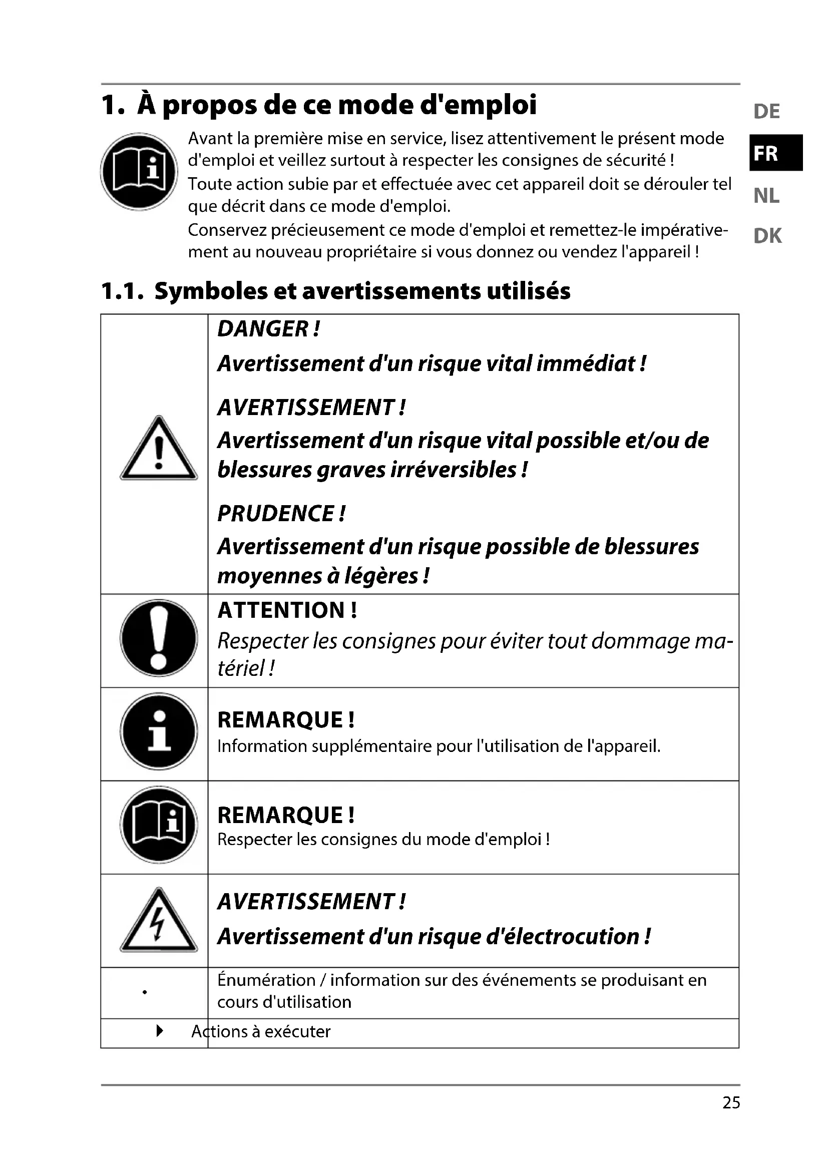 Avant la première mise en service, lisez attentivement le présent mode d'emploi et veillez surtout à respecter les consignes de sécurité! Toute action subie par et effectuée avec cet appareil doit se dérouler tel que décrit dans ce mode d'emploi. Conservez précieusement ce mode d'emploi et remettez-le impérative- ment au nouveau propriétaire si vous donnez ou vendez l'appareil! 1.1. Symboles et avertissements utilisés DANGER ! Avertissement d'un risque vital immédiat ! AVERTISSEMENT ! Avertissement d'un risque vital possible et/ou de blessures graves irréversibles! PRUDENCE ! Avertissement d'un risque possible de blessures moyennes à légères ! ATTENTION! Respecter les consignes pour éviter tout dommage ma- tériel ! REMARQUE ! Information supplémentaire pour l'utilisation de l'appareil. REMARQUE ! Respecter les consignes du mode d'emploi ! AVERTISSEMENT ! Avertissement d'un risque d'électrocution !
